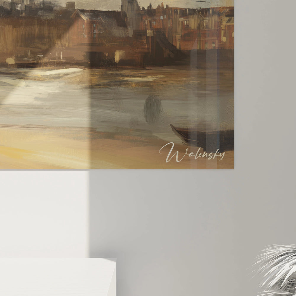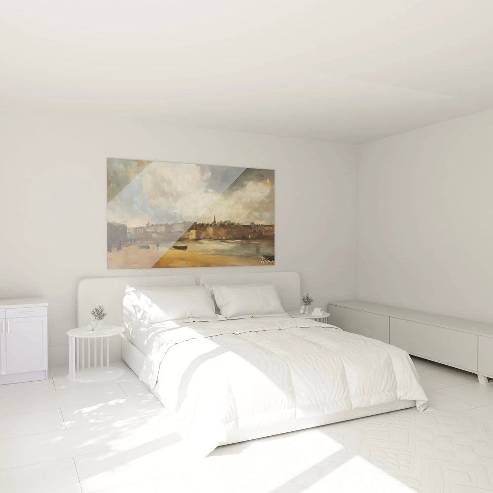 Imaginez-vous près d’une rivière où l’eau réfléchit la lumière avec une douceur palpable, tandis que le ciel anime cette toile par ses nuances changeantes. Au fil des coups de pinceau, le mouvement léger des nuages contraste avec la stabilité imposante des silhouettes architecturales, conférant à l’ensemble une profondeur vibrante et une sensation de calme absolu.