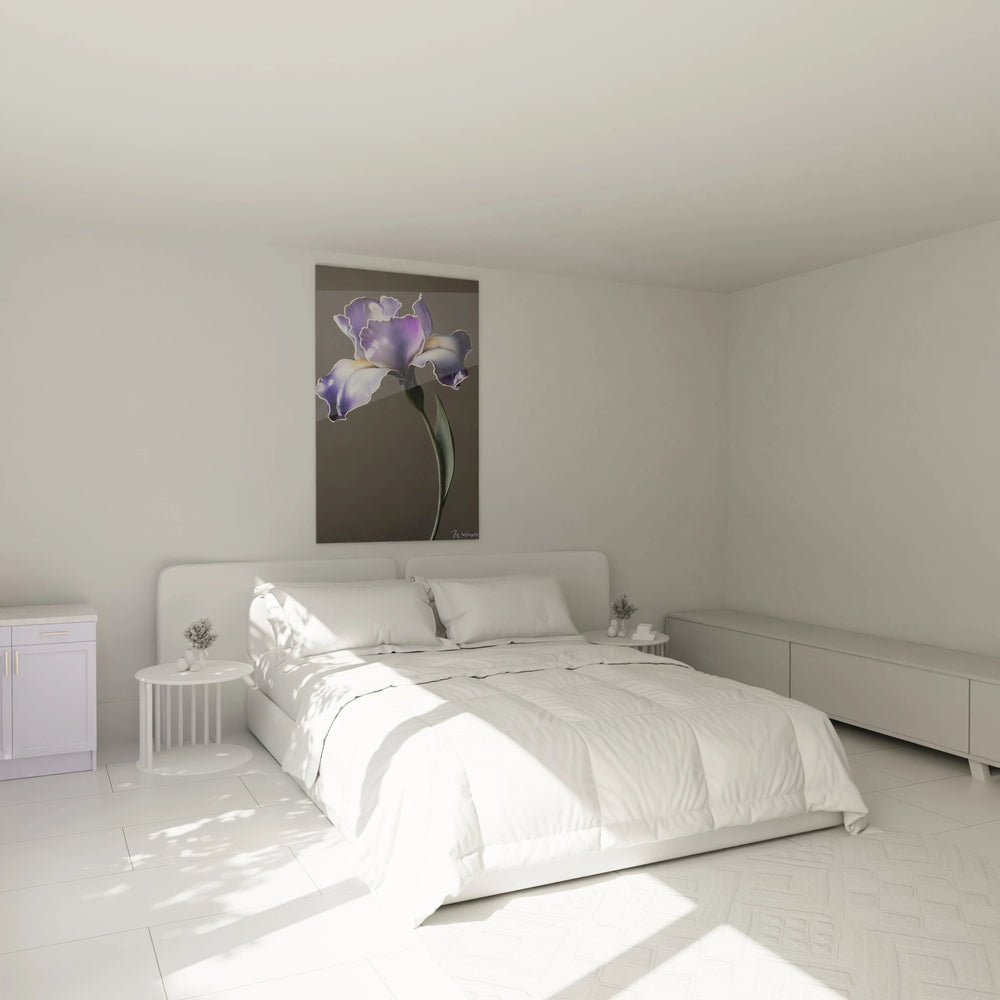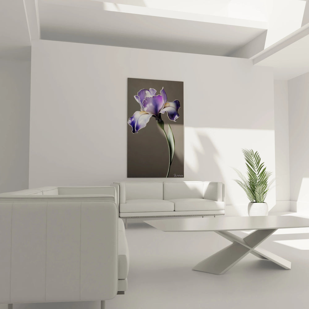 Ce tableau allie finesse et profondeur grâce à des couleurs harmonieuses mêlant violet, blanc et argent. Ces teintes précieuses créent un équilibre subtil entre pureté et intensité, évoquant une atmosphère à la fois apaisante et fascinante. Vous pouvez presque sentir la caresse légère du vent sur les pétales, entendre le murmure silencieux de cette fleur dans un jardin paisible. L’effet tridimensionnel des textures révèle chaque veinure comme une sculpture vivante, invitant à une contemplation prolongée.