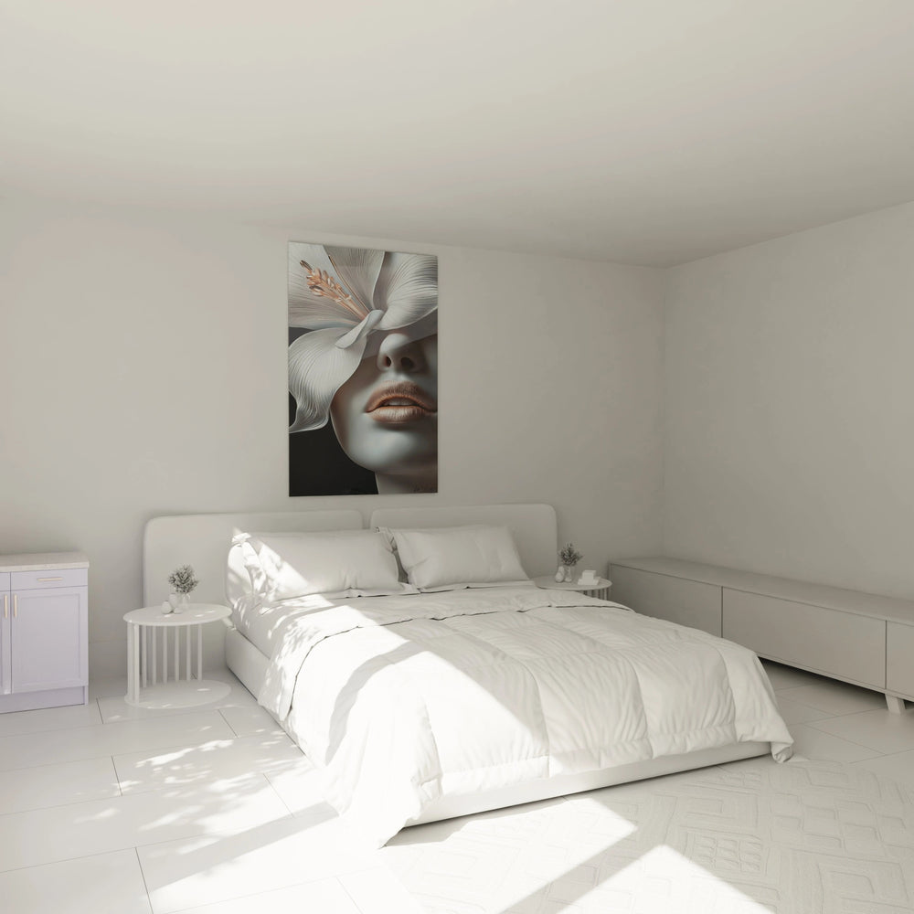 L'élément le plus distinctif de ce tableau fleur visage est sans doute la façon dont les pétales blancs semblent émerger du visage, créant une métamorphose visuelle fascinante. Cette transformation poétique entre l'humain et le floral crée une œuvre d'une rare subtilité qui invite à la contemplation prolongée.
