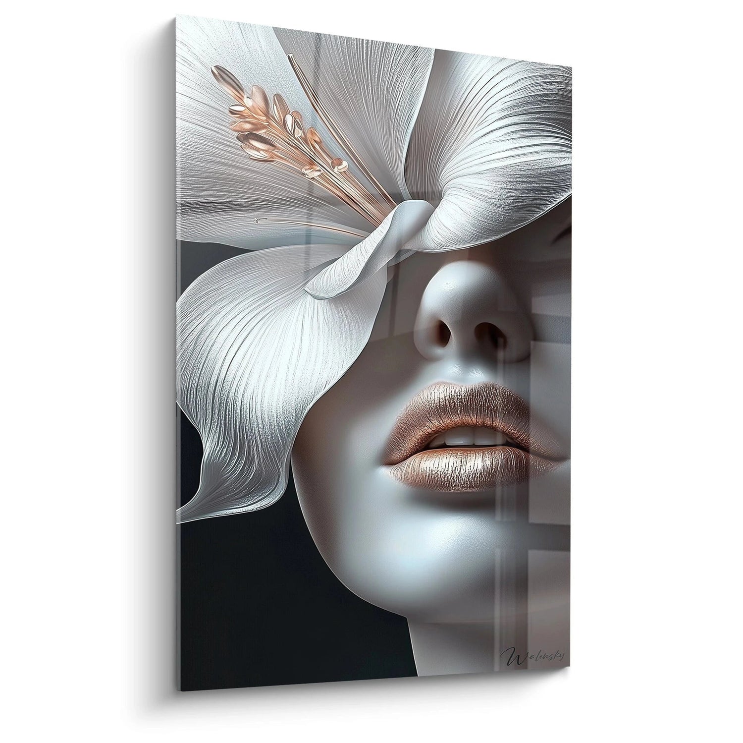 Le jeu d'ombre et de lumière sur ce tableau fleur visage élégance est particulièrement remarquable, avec des reflets subtils qui accentuent les courbes et les volumes. La peau du visage présente une texture lisse et porcelainée qui contraste avec les lèvres métallisées aux reflets rosés. Cette juxtaposition de textures différentes - le velouté, le brillant, le strié - confère à l'œuvre une profondeur tactile qui invite presque au toucher.