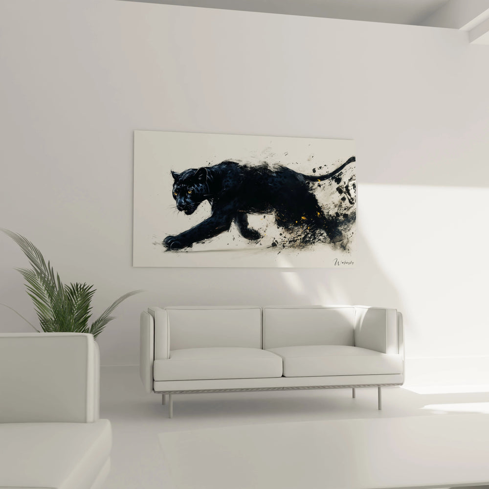 L'œuvre se distingue par sa technique d'éclaboussures d'encre qui donne l'impression que le félin émerge littéralement de la toile, brouillant les frontières entre réalité et abstraction. Cette décoration murale féline allie magistralement précision anatomique et expression artistique libre, créant une tension visuelle captivante qui maintient le regard en éveil.