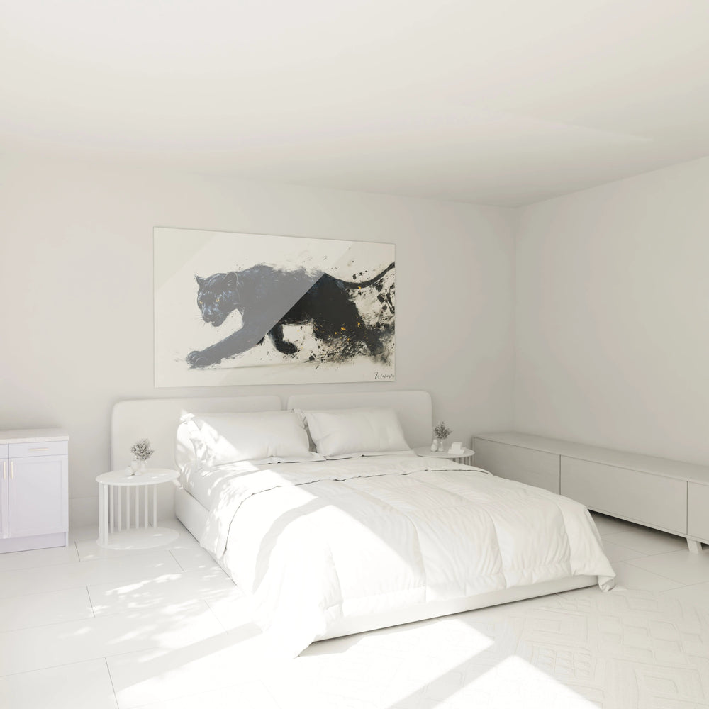 La palette chromatique de ce tableau jaguar repose sur un minimalisme saisissant qui en fait toute sa force expressive. Dominée par un noir profond aux multiples nuances qui composent le corps massif du félin, elle est contrebalancée par le blanc immaculé du fond qui crée un contraste maximal. Cette bichromie puissante est subtilement enrichie par des touches de jaune ambré qui illuminent les yeux perçants du jaguar.