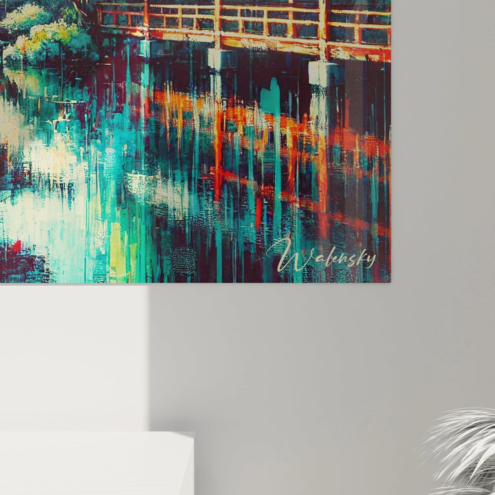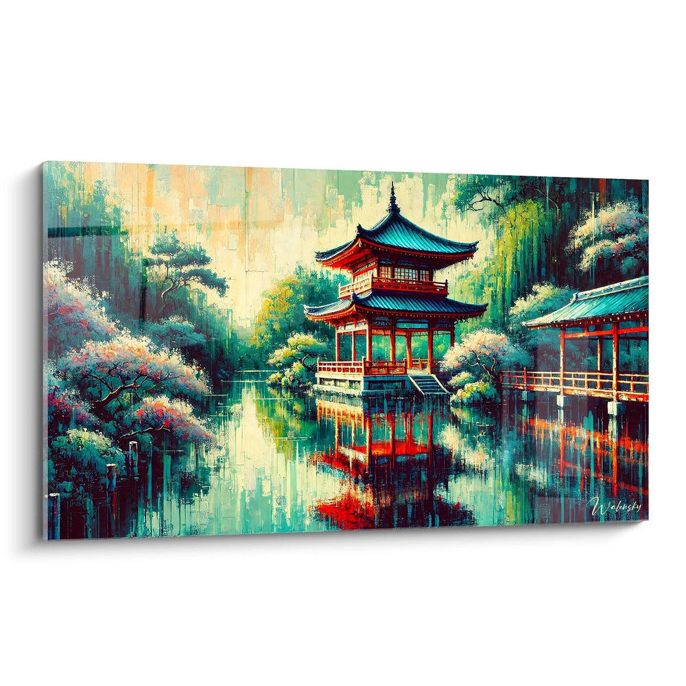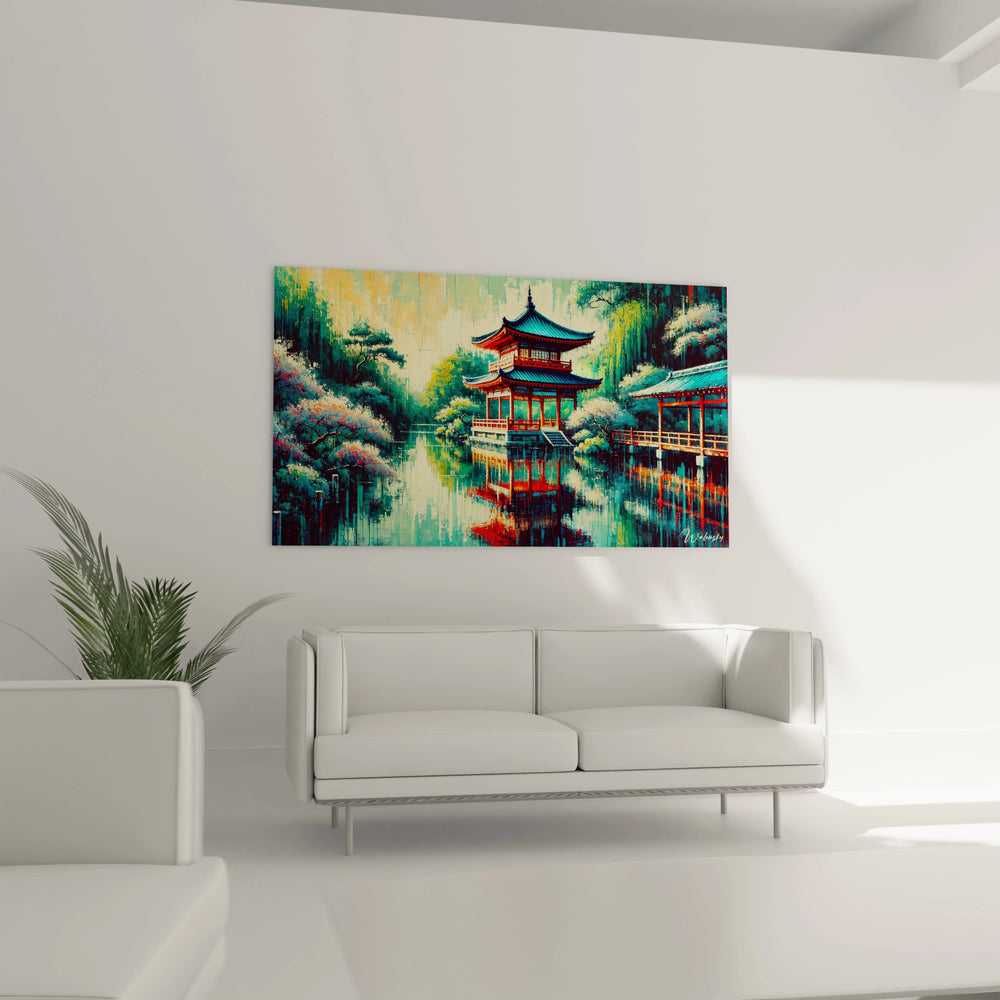 Imaginez-vous flâner au cœur d’un temple japonais, le doux murmure de l’eau et le bruissement feutré des feuilles accompagnant chaque pas. Ce tableau vous offre ce moment suspendu, cet instant où le temps ralentit et où la beauté prend toute la place. Ses couleurs, riches et équilibrées – un rouge passion, un vert apaisant, et un bleu profond – évoquent la nature dans toute sa poésie et sa simplicité raffinée.