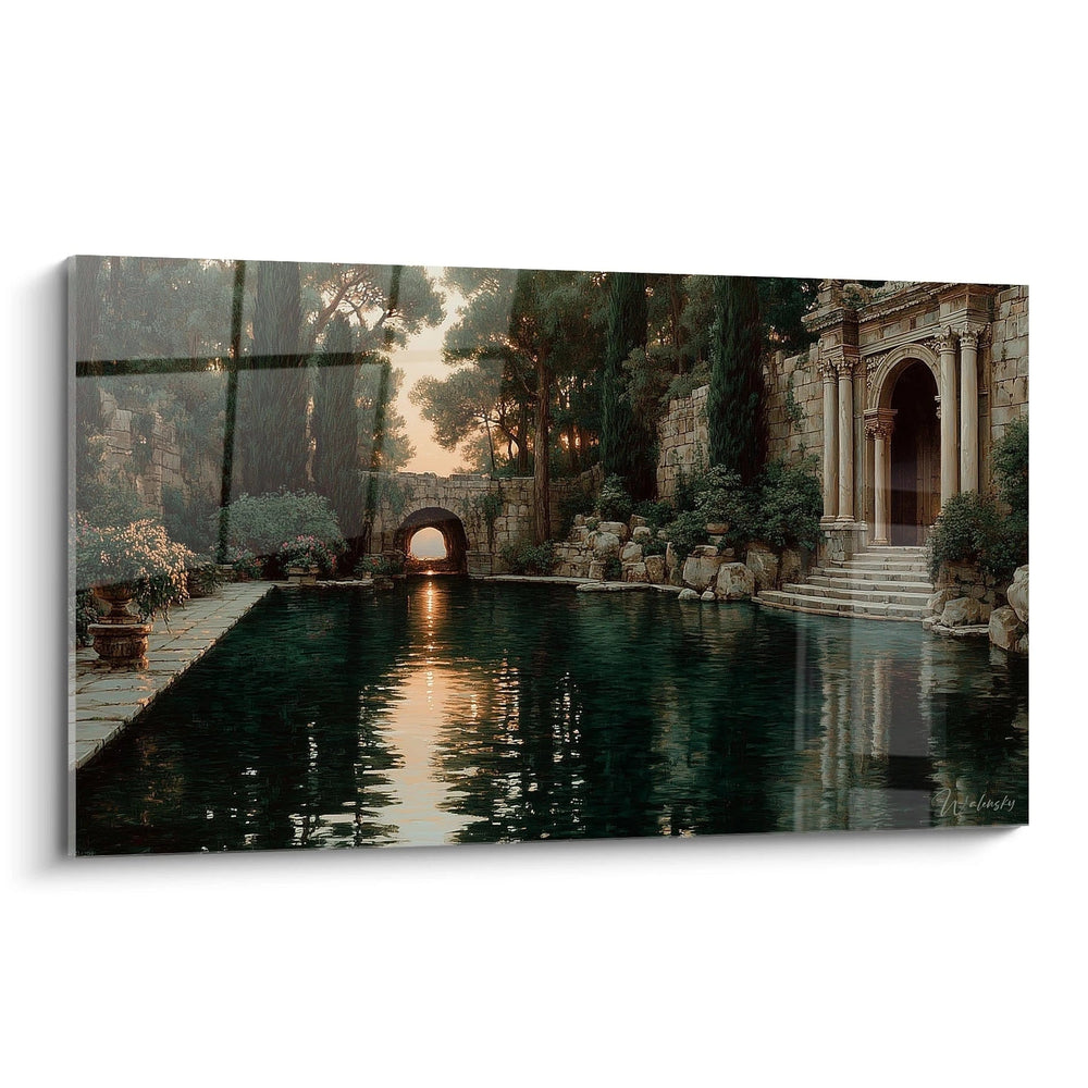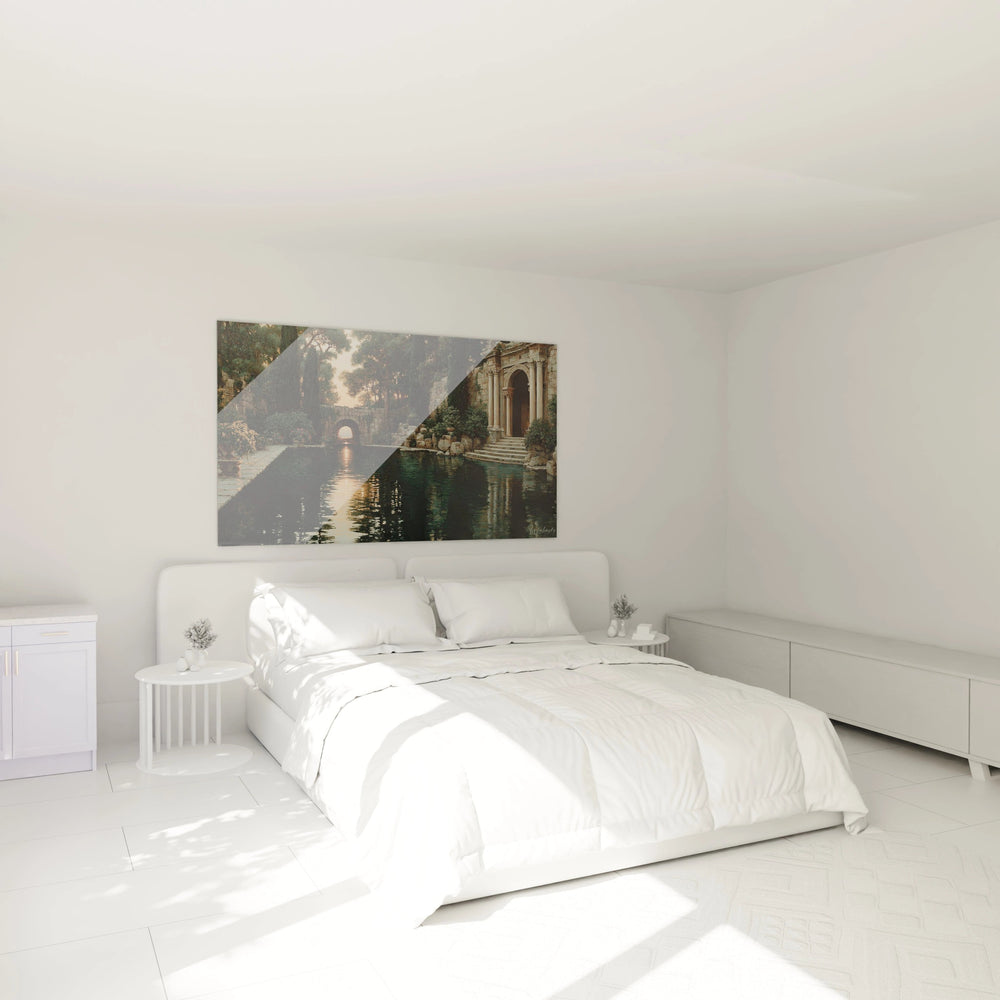 La composition de ce tableau jardin antique s'articule autour d'une perspective centrale menant vers l'arche de pierre, créant une profondeur remarquable. Le bassin occupe le premier plan, agissant comme un miroir naturel qui amplifie visuellement l'espace. Les colonnes du portique, positionnées sur la droite, créent un rythme vertical qui contraste avec les lignes horizontales du bassin et des terrasses. Cette décoration murale jardin présente un équilibre asymétrique sophistiqué, où chaque élément architectural trouve sa place sans encombrer la composition. Les arbres majestueux encadrent naturellement la scène, guidant le regard vers le point focal central que constitue l'arche illuminée.