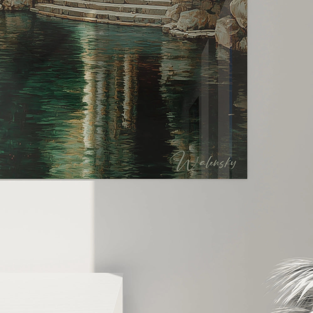 L'expérience visuelle de ce tableau jardin antique évolue considérablement selon la distance d'observation. Vue de près, l'œuvre révèle une multitude de détails architecturaux fins : les nervures des feuilles de lierre, les variations chromatiques des pierres, les reflets complexes sur l'eau. À distance moyenne, la composition générale prend tout son sens, révélant l'équilibre parfait entre les différents plans. En recul, c'est l'atmosphère générale qui domine, cette sensation de sérénité méditerranéenne si caractéristique. Ce tableau jardin antique profondeur utilise intelligemment les variations de netteté pour guider le regard et créer une hiérarchie visuelle naturelle.