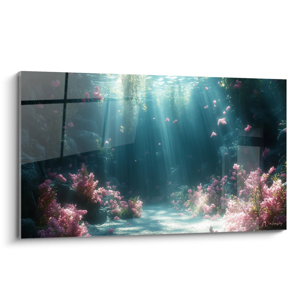 La palette chromatique de ce tableau fonds marins décoratif évoque la régénération et la paix intérieure. Les roses coralliens symbolisent l'amour de la nature, tandis que les bleus turquoise représentent la sérénité et la méditation. Les rayons lumineux dorés apportent une dimension spirituelle, suggérant l'espoir et la renaissance dans cet écosystème aquatique préservé.