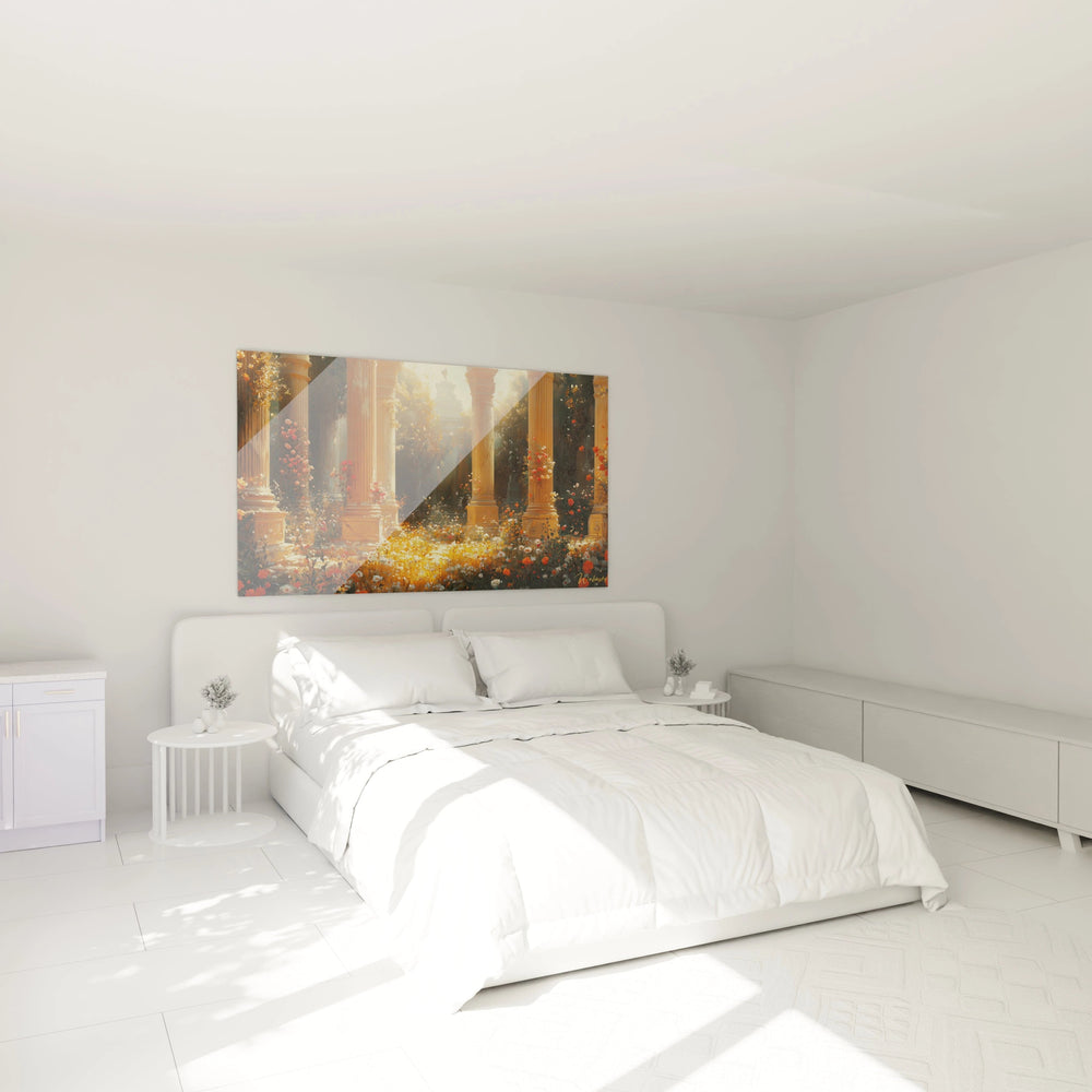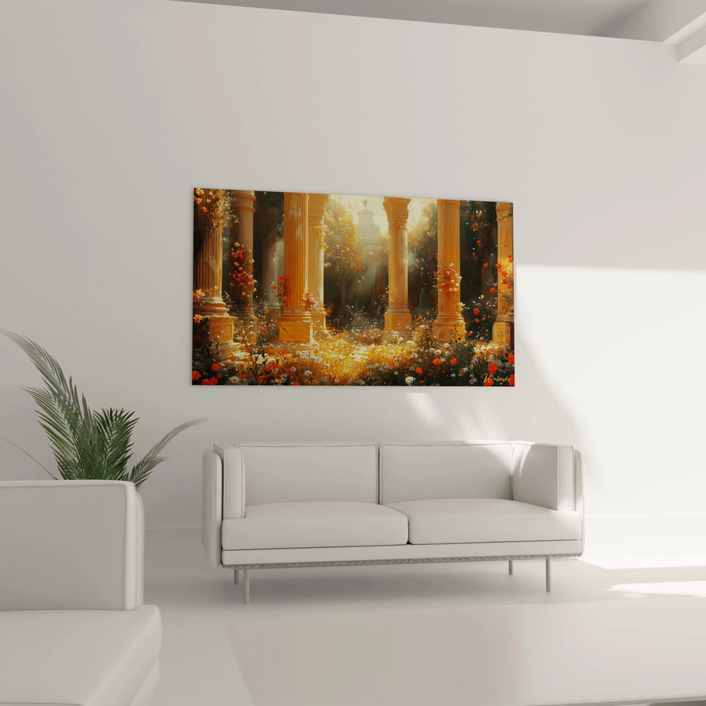 Cette œuvre est bien plus qu’un simple tableau. C’est une atmosphère, une expérience sensorielle capable de métamorphoser votre intérieur. Dès que vous poserez votre regard sur ses nuances chaudes d’or et d’orange, vous ressentirez cette chaleur douce qui rappelle les premiers rayons du soleil caressant un sanctuaire ancien. Les détails minutieux des colonnes classiques, baignées d’une lumière presque mystique, contrastent avec la luxuriance vibrante des fleurs, offrant une profondeur saisissante qui invite à la contemplation et à la rêverie.