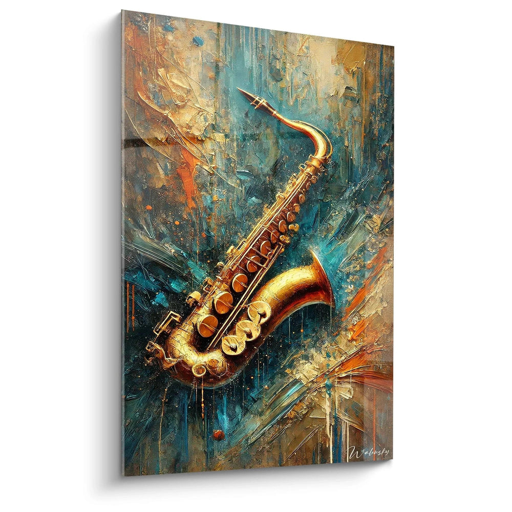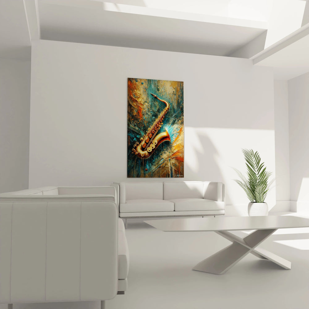 Ce tableau incarne lâĂąme vibrante du jazz Ă travers une explosion de couleurs chaudes et profondes. Les nuances dâor et dâorange dansent avec les bleus profonds pour recrĂ©er la chaleur du cuivre et la fraĂźcheur mystĂ©rieuse de la nuit. La texture riche, presque palpable, Ă©voque les mouvements fluides et improvisĂ©s dâun solo de saxophone, oĂč chaque Ă©clat dorĂ© symbolise une note suspendue dans lâair.