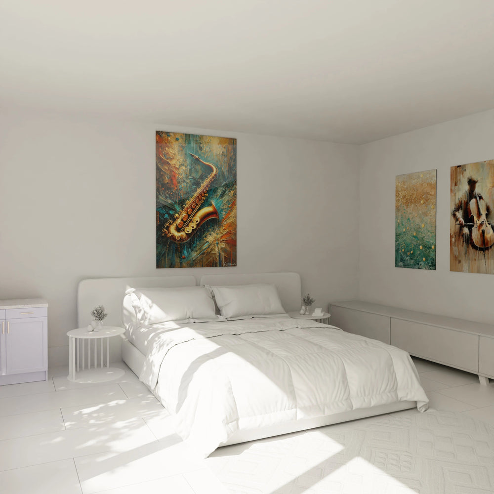 Au-delĂ dâun simple Ă©lĂ©ment dĂ©coratif, ce tableau est une cĂ©lĂ©bration de la spontanĂ©itĂ©, de la libertĂ© et de la crĂ©ativitĂ© inhĂ©rentes au jazz. Il Ă©voque cette alchimie entre la mĂ©lancolie et lâexaltation, vous invitant Ă ressentir chaque note et chaque Ă©motion comme si vous y Ă©tiez.
