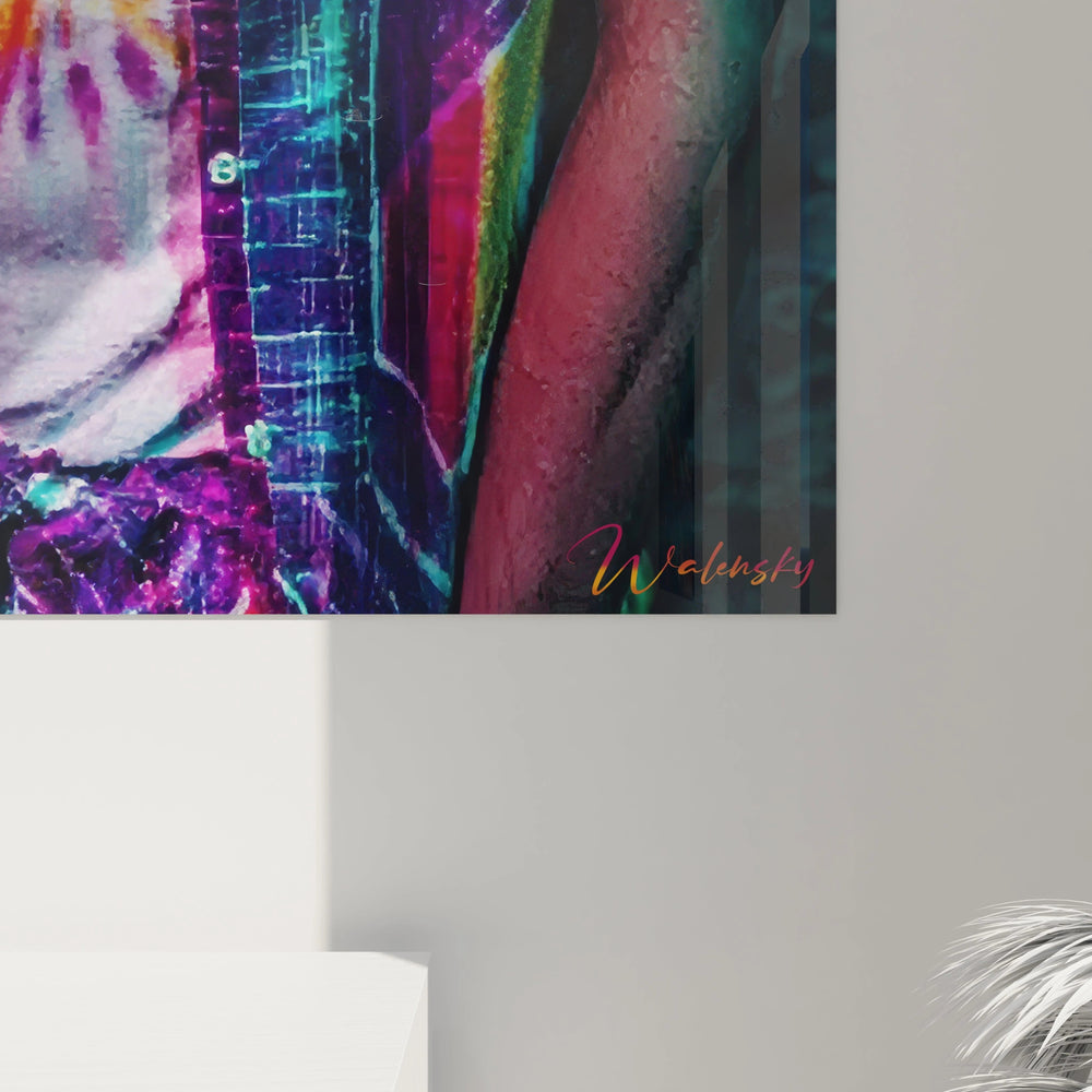 La palette chromatique de cette œuvre streetwear véhicule une symbolique profonde liée à la culture urbaine moderne. Les tons néon rose et bleu-vert évoquent l'énergie nocturne des métropoles, symbolisant la vitalité et le dynamisme de la jeunesse urbaine. L'orange des verres de lunettes représente la chaleur humaine au cœur de l'environnement technologique, tandis que les violets et bleus de la chemise expriment la créativité et l'individualité. Ces couleurs saturées, caractéristiques de l'esthétique cyberpunk, créent un contraste saisissant qui attire l'œil et transmet une énergie positive. L'ensemble chromatique reflète l'optimisme et la confiance de la génération connectée, naviguant entre réel et virtuel. Cette palette néon streetwear s'harmonise parfaitement avec les intérieurs modernes urbains.