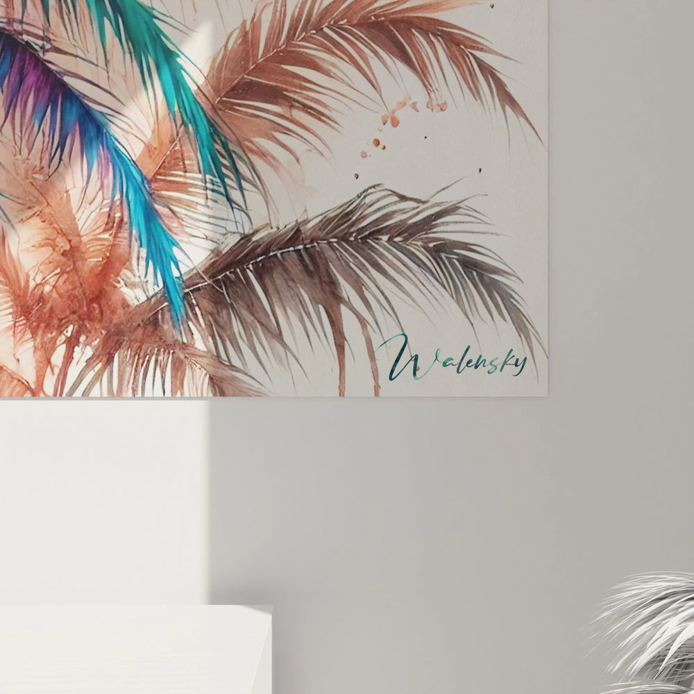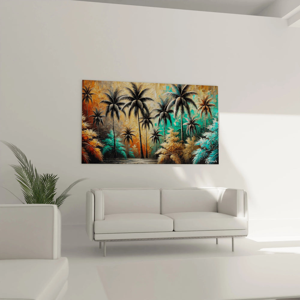 Ce tableau ne se contente pas d’habiller un mur, il évoque une atmosphère où règne la tranquillité. Chaque coup de pinceau suggère la douceur d’une brise tropicale et la chaleur enveloppante du soleil couchant. Grâce à ses lignes élancées et son jeu subtil de couleurs chaudes et fraîches, il invite votre esprit à se détacher du quotidien et à savourer un moment de paix et d’inspiration.