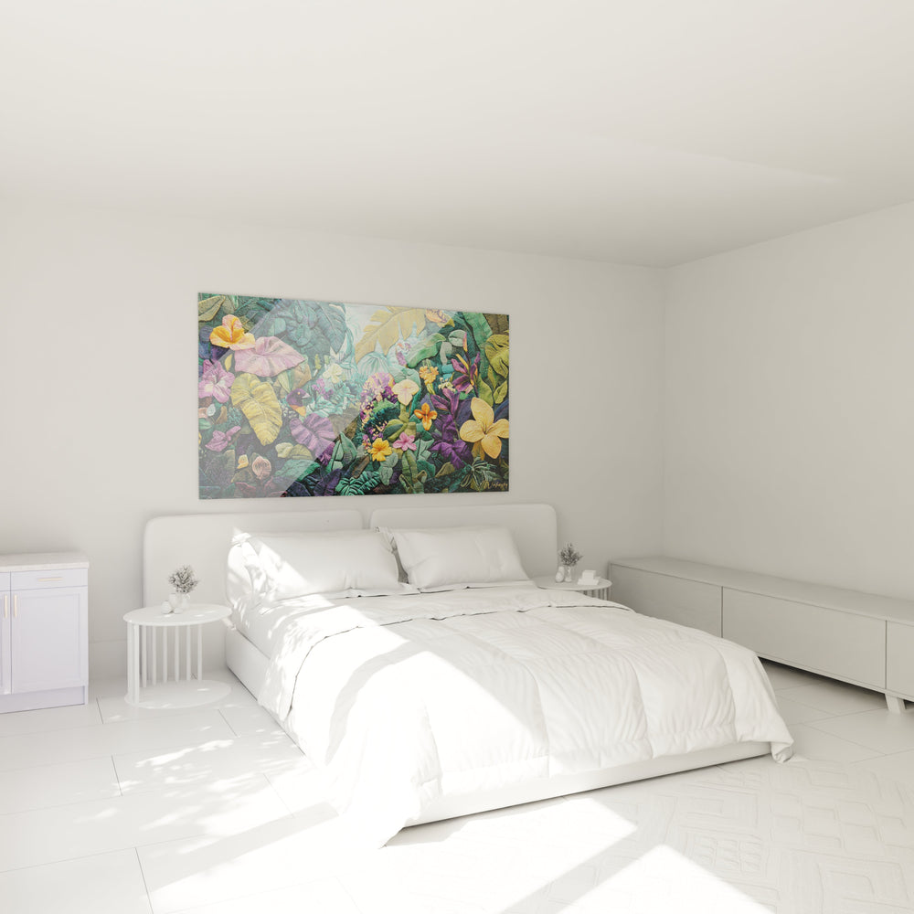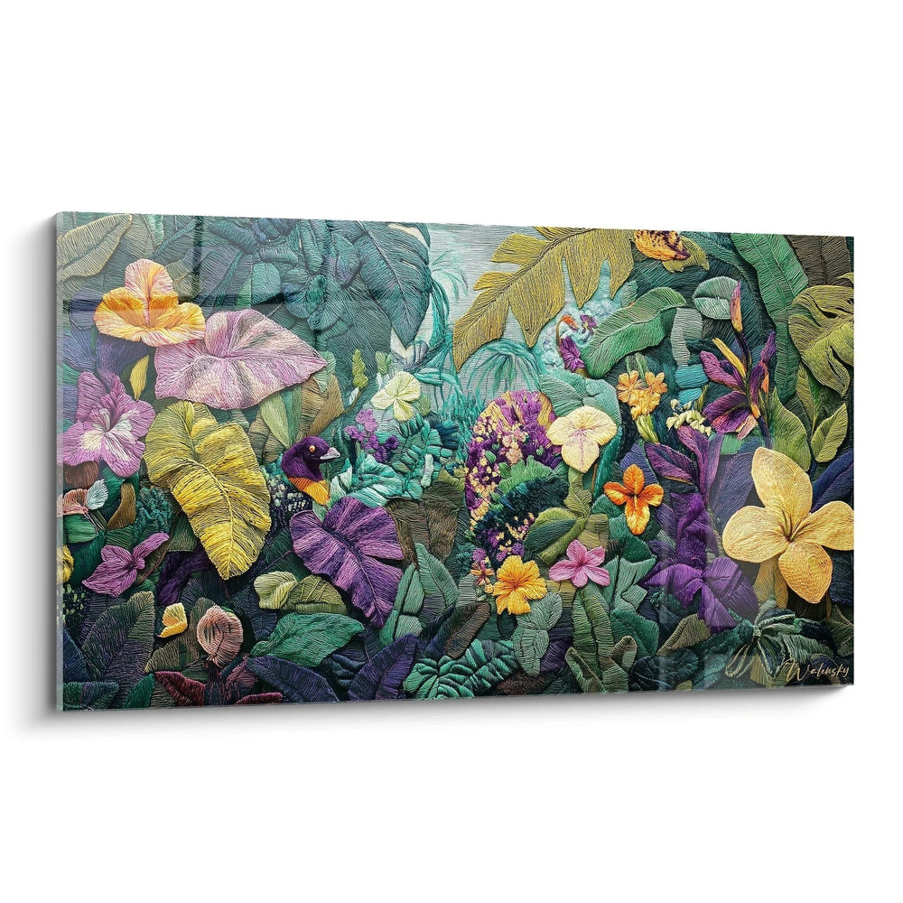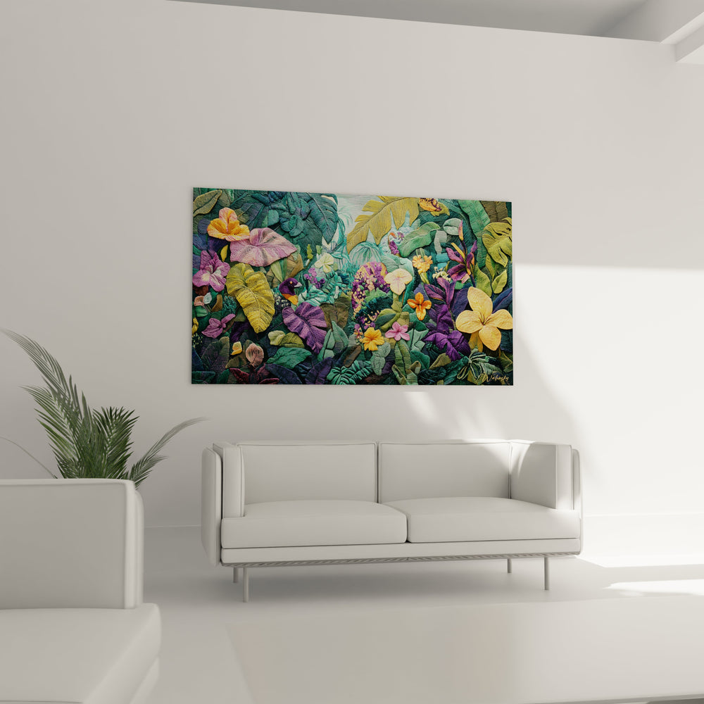 Imaginez-vous caresser du regard les reliefs délicats de fleurs aux couleurs éclatantes, sentir presque la fraîcheur de la végétation luxuriante et entendre le bruissement secret des feuilles sous une lumière tamisée. Ce tableau transcende la simple décoration : il crée une atmosphère immersive, où la richesse des textures et la profondeur des nuances vertes, violettes et dorées dialoguent avec votre espace, en y déployant une énergie à la fois apaisante et stimulante.