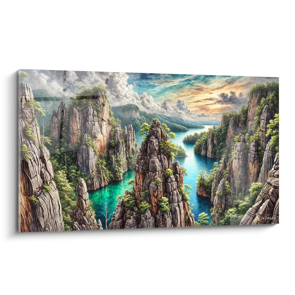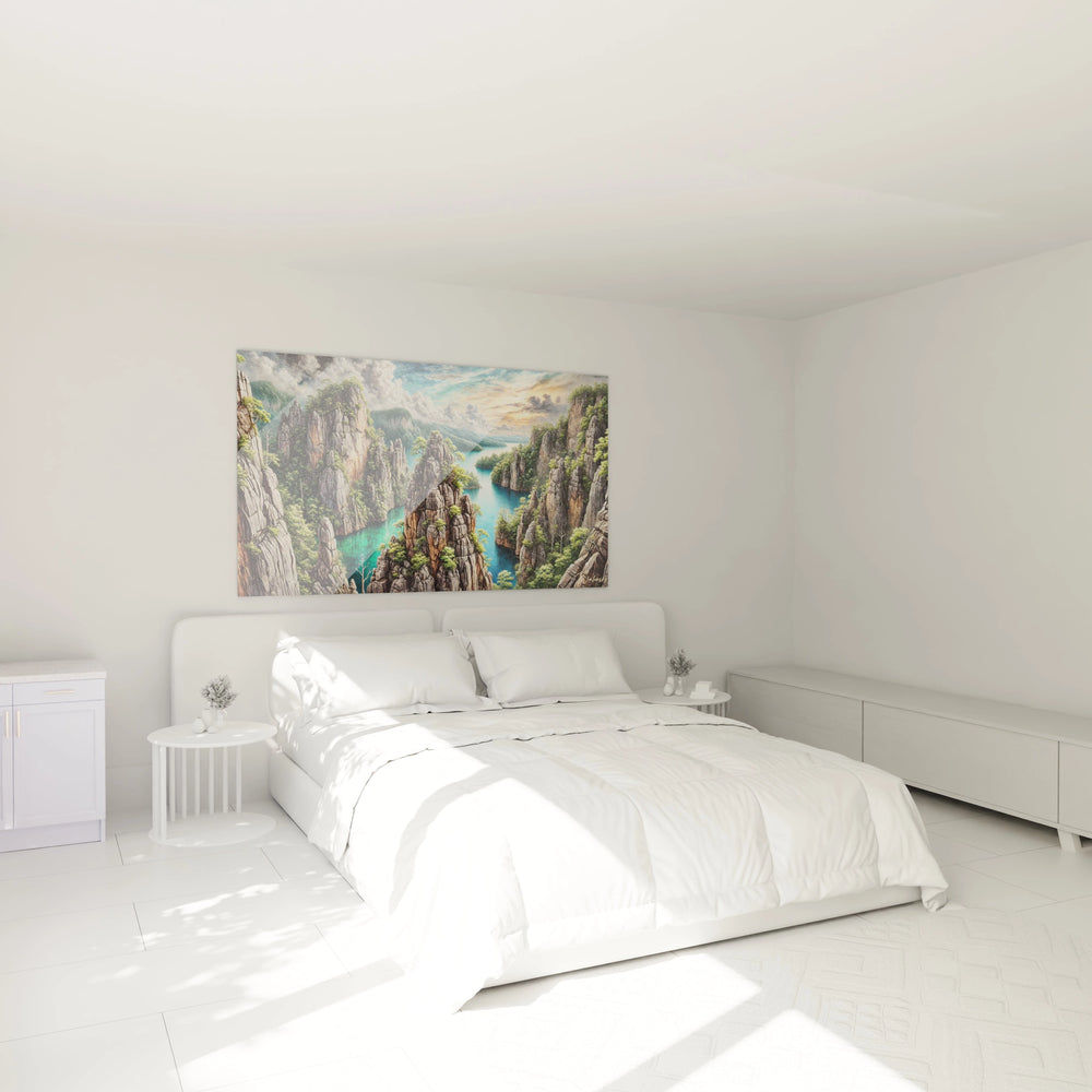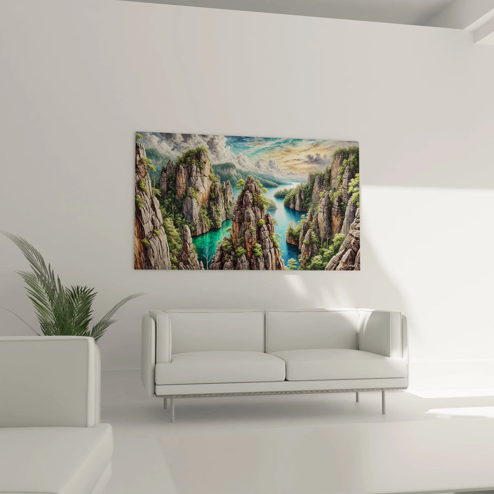 Chaque regard posé sur ce tableau vous transporte dans les profondeurs d’un paysage où la nature règne en maître. La robustesse des rochers, aux nuances de gris et de brun, vous enveloppe d’une sensation de stabilité et de force tranquille. En contraste, les eaux aux nuances vibrantes de bleu turquoise invitent à la rêverie et à la paix intérieure. Les touches de vert vif des arbres accrochés aux falaises rappellent la résilience et la vie qui s’épanouissent même dans les lieux les plus inattendus.