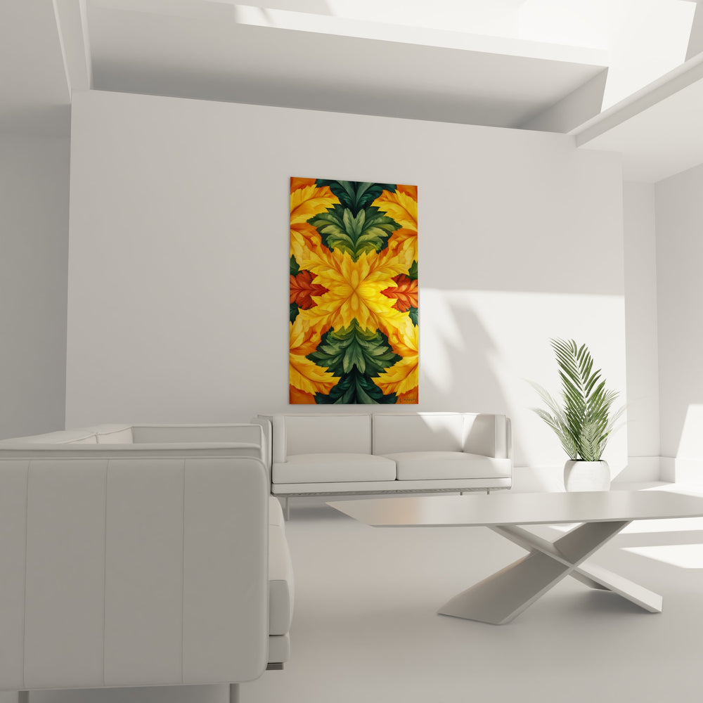 Ce tableau mural fractale présente un magnifique kaléidoscope floral aux motifs géométriques hypnotiques. L'œuvre révèle un mandala automnal sophistiqué où les feuillages dorés et orangés se déploient en parfaite symétrie autour d'un centre lumineux. Les fractales géométriques florales créent une composition en étoile à huit branches, alternant entre des tons chauds d'or, d'orange et de cuivre, contrastés par des verts profonds et émeraude. Cette décoration murale fractale capture l'essence de l'automne dans une interprétation mathématique et artistique saisissante. Les détails minutieux des nervures de feuilles se répètent et se transforment selon les principes fractals, créant une profondeur visuelle remarquable. Le tableau géométrique nature offre une perspective unique sur la beauté végétale, où chaque élément s'imbrique parfaitement dans l'ensemble. Les gradients de couleurs automnales apportent une chaleur naturelle à l'espace, tandis que la structure géométrique rigide équilibre cette douceur organique. Cette œuvre d'art fractale contemporaine transforme les motifs naturels en une création digitale sophistiquée, parfaite pour sublimer un intérieur moderne.