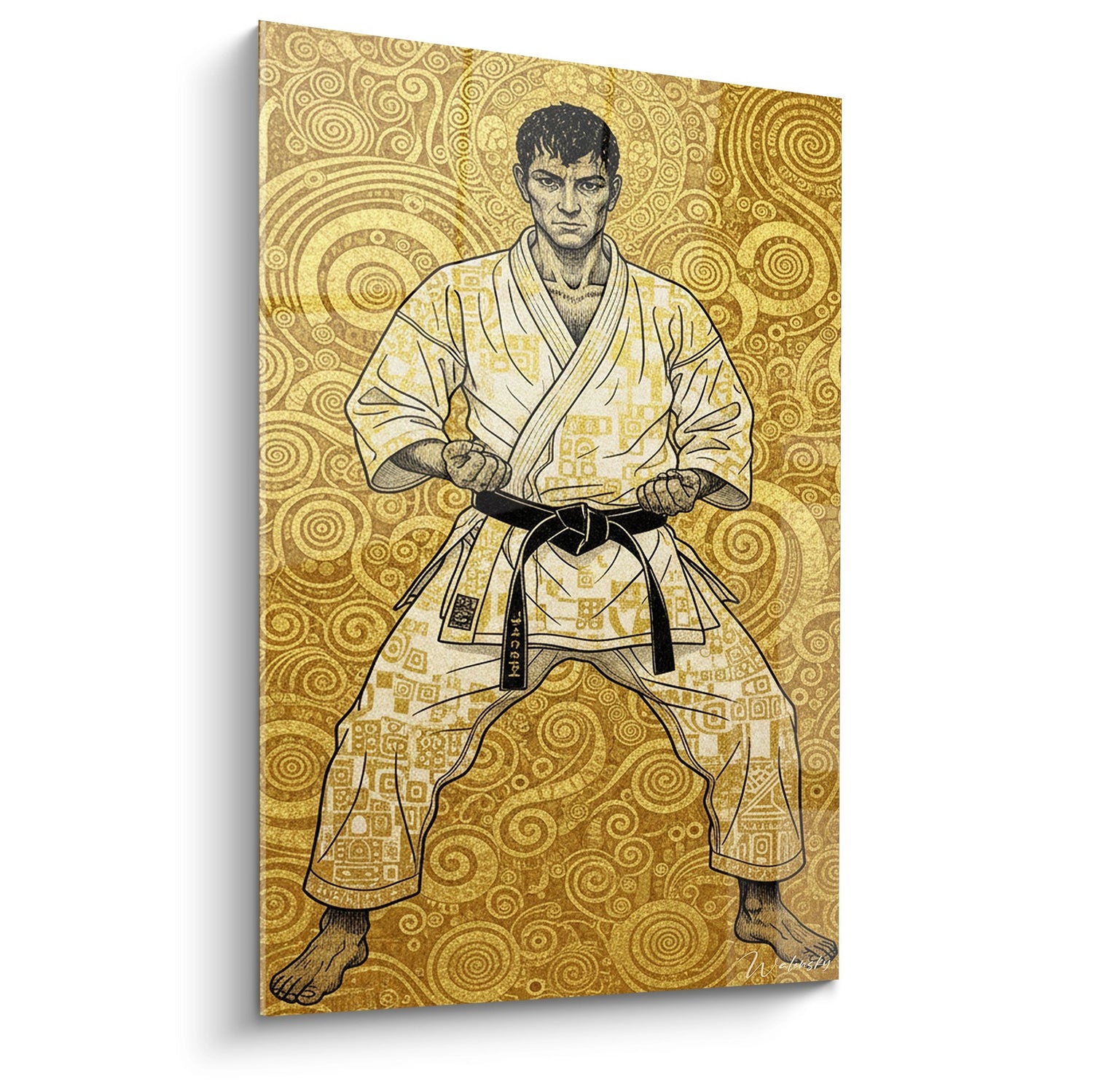 Cette œuvre s'inspire des codes esthétiques de Gustav Klimt pour son fond ornemental doré, tout en conservant un réalisme contemporain dans la représentation du karatéka. Elle fait écho aux estampes japonaises traditionnelles qui glorifiaient les guerriers, adaptées ici à l'art martial moderne. Cette fusion East-West crée une pièce unique alliant tradition orientale et esthétique occidentale.