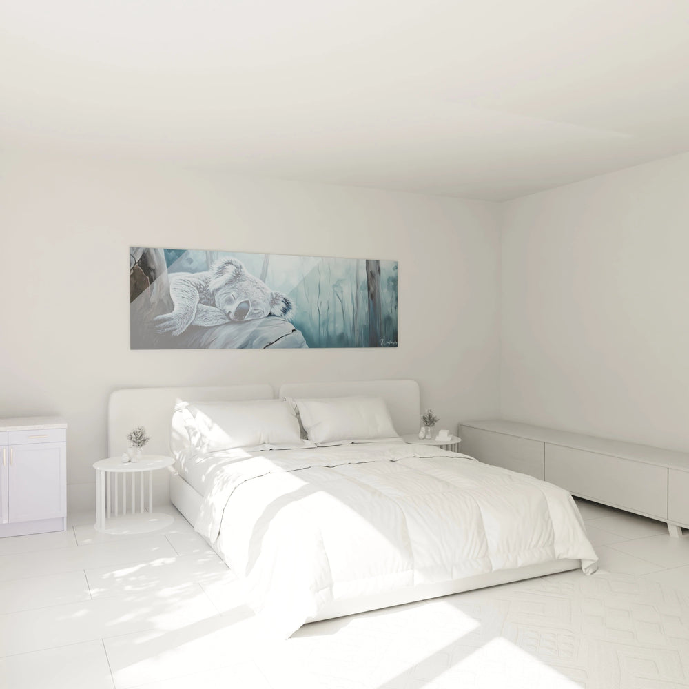 Ce tableau koala capture avec une délicatesse remarquable l'essence même de la tranquillité. L'œuvre présente un koala endormi dans une position naturelle de repos, niché confortablement contre une surface rocheuse. La première impression visuelle est celle d'une sérénité profonde, amplifiée par une palette chromatique dominée par des tons bleus apaisants. Ce tableau koala dormant paisiblement se distingue par son réalisme saisissant et sa capacité à transmettre une sensation de calme absolu. L'élément le plus distinctif réside dans l'expression faciale détendue de l'animal, avec ses yeux clos qui évoquent un sommeil profond et réparateur.