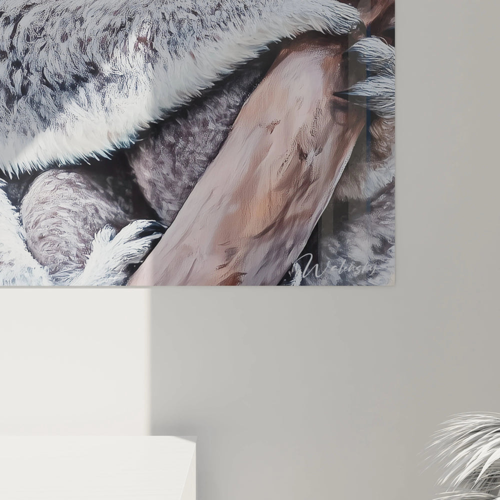La composition de cette œuvre koala australien s'articule autour d'un placement central des sujets, créant un équilibre parfait dans le cadre. Le koala adulte occupe les deux tiers de l'espace, son corps formant une courbe protectrice autour du petit. La branche d'eucalyptus traverse diagonalement la composition, servant de support structural et guidant le regard vers le duo. L'arrière-plan volontairement flou met en valeur les protagonistes principaux. Cette art mural koala réaliste utilise une perspective légèrement en contre-plongée qui magnifie la majesté de ces marsupiaux. L'espace négatif autour des sujets permet de concentrer l'attention sur l'intimité de cette scène familiale.