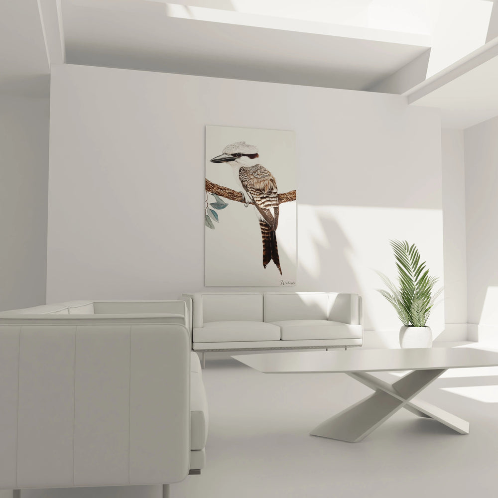Ce tableau kookaburra ambiance sereine s'intègre parfaitement dans des environnements aux tons neutres et naturels. Un éclairage indirect met en valeur les subtilités chromatiques sans créer de reflets gênants. Les couleurs complémentaires recommandées incluent les verts sauge, les beiges chauds et les blancs cassés. Cette œuvre convient particulièrement aux espaces de détente, bibliothèques ou bureaux, où sa présence apaisante favorise la concentration. Un mur de couleur claire fait ressortir la richesse des détails, tandis qu'un encadrement simple préserve l'élégance naturelle de l'ensemble.