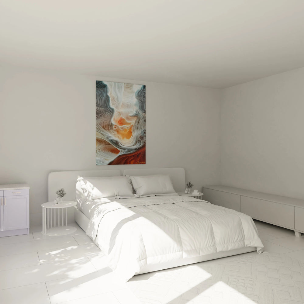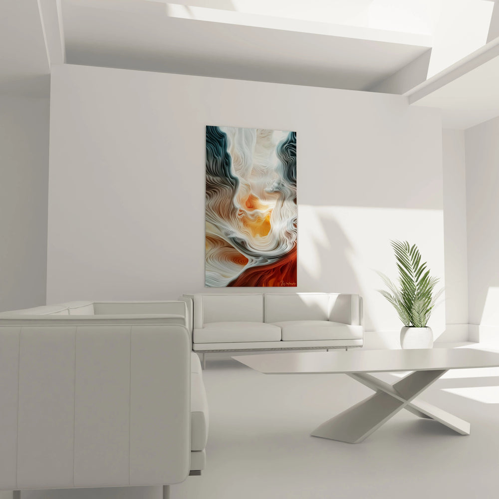 Chaque courbe, chaque relief de ce tableau raconte le mouvement figé du temps sculpté par les eaux et les vents. Les ondulations organiques, élaborées avec un souci du détail extrême, évoquent des paysages secrets et profonds : des canyons mystérieux, des grottes calcaires où la lumière joue avec la texture comme dans un ballet silencieux. À travers cette œuvre, vous ressentez presque la douceur d’un souffle, l’écho d’un murmure minéral.