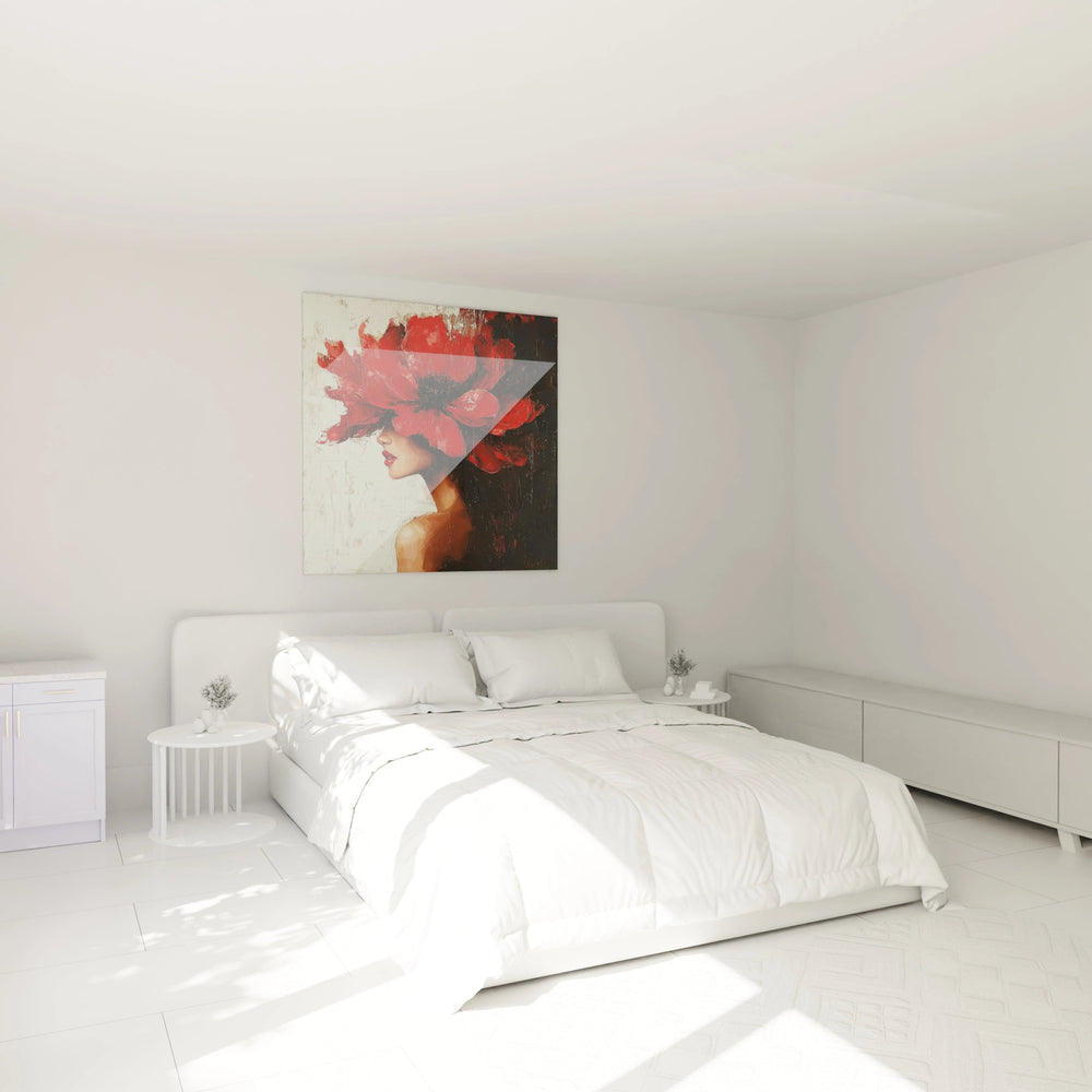 Ce tableau fleur rouge femme captive immédiatement par son contraste saisissant entre l'intensité écarlate de la fleur et la délicatesse du profil féminin qu'elle surplombe. L'œuvre présente une composition audacieuse où une imposante fleur rouge, semblable à un coquelicot ou à une pivoine, occupe presque la moitié supérieure de la toile. Le visage de la femme, partiellement visible de profil, révèle des lèvres rouges éclatantes qui font écho à la teinte dominante de la composition.