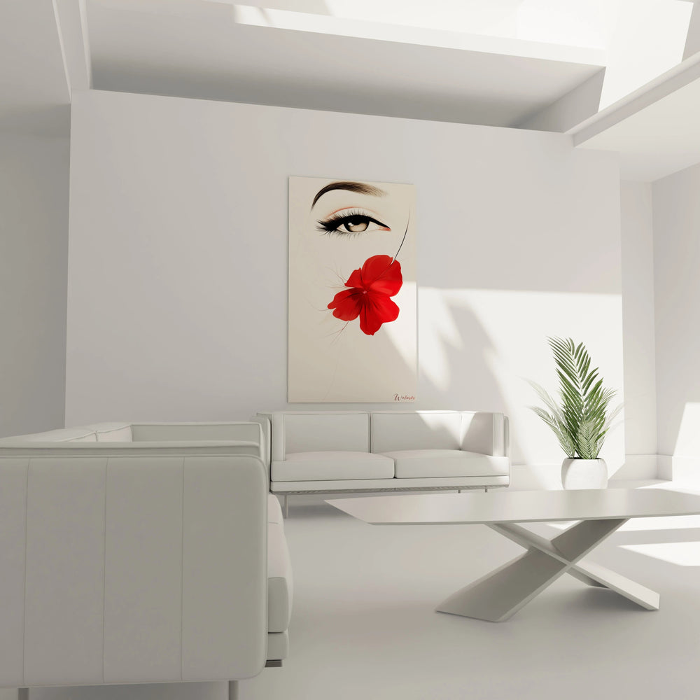 Ce tableau visage floral saisit l'œil dès le premier regard par sa composition épurée et sa puissance expressive. L'œuvre présente un visage féminin partiellement révélé, dominé par un œil expressif magnifiquement détaillé et une fleur rouge éclatante qui remplace symboliquement la joue. Cette juxtaposition inattendue entre l'anatomie humaine et l'élément botanique crée un tableau visage minimaliste d'une grande force visuelle.