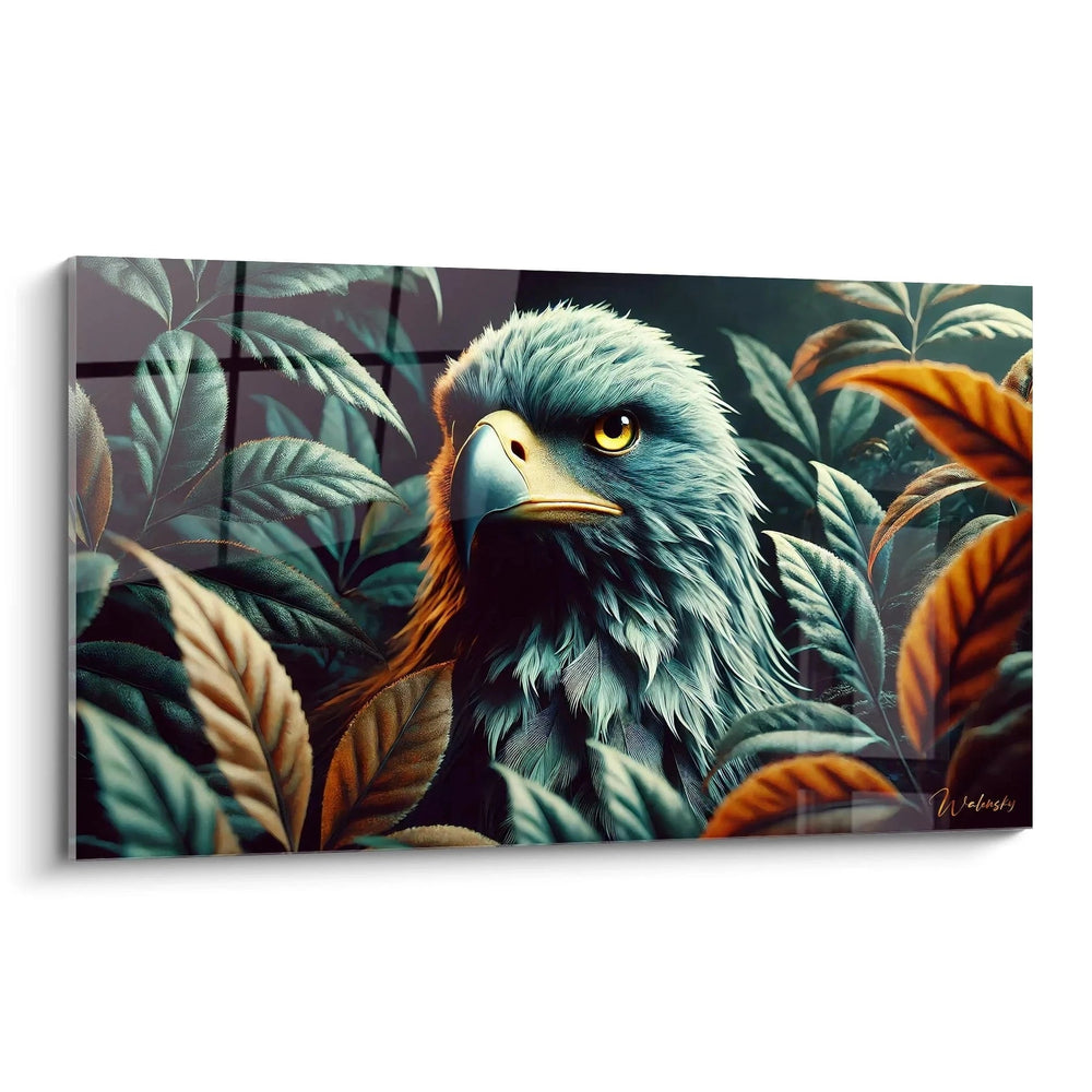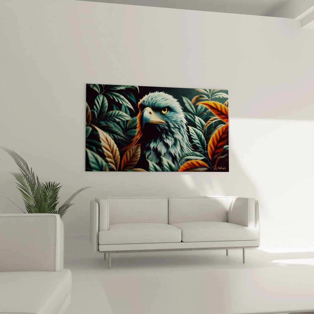 Cette œuvre unique, inspirée par une balade en forêt baignée d’une lumière dorée, vous invite à ressentir la profondeur d’un instant suspendu. L’aigle, majestueusement posé au centre, évoque le symbole intemporel de puissance et de vigilance. Autour de lui, les feuillages luxuriants en verts profonds et nuances chaleureuses d’orange créent une atmosphère enveloppante, presque tactile, qui vous transporte loin du tumulte quotidien.