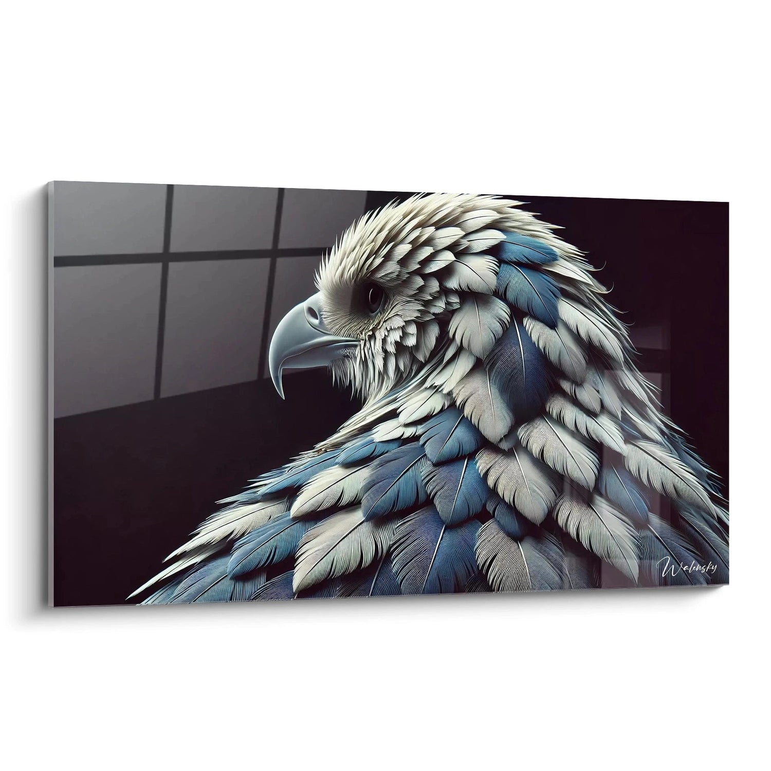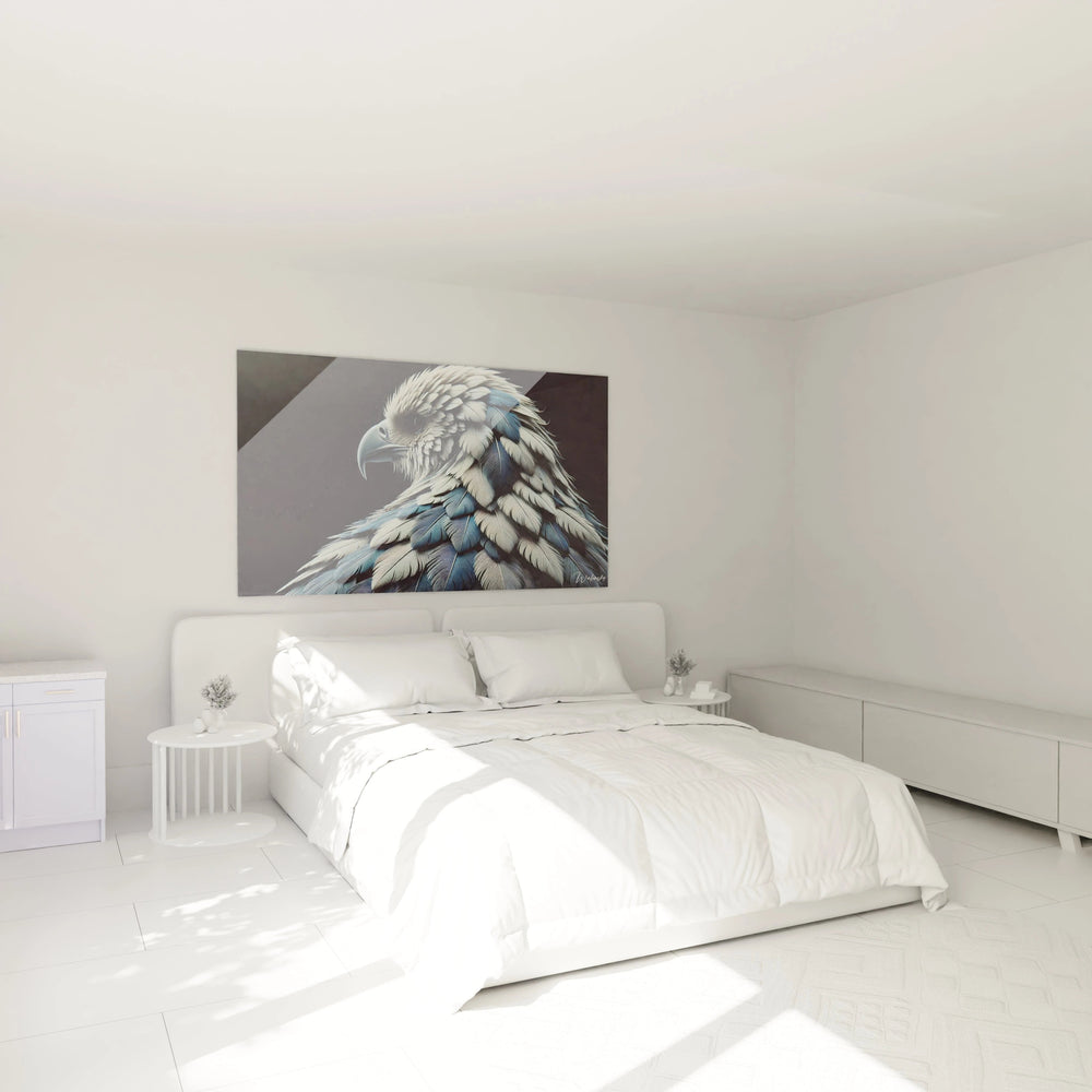Ce tableau capture l’énergie vibrante d’un aigle prêt à s’élancer, déployant ses plumes comme une armure majestueuse. Chaque détail, magnifié avec une finesse remarquable, crée une sensation presque tactile, comme si vous pouviez effleurer la légèreté et la résistance de son plumage. Les nuances de bleu, gris et blanc s’entrelacent pour produire une atmosphère à la fois apaisante et imposante, où calme et puissance cohabitent en parfaite harmonie.