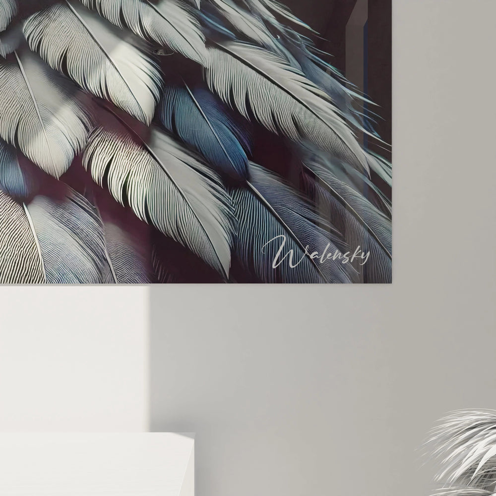 Associez ce tableau à des meubles en bois sombre pour accentuer son caractère noble, ou intégrez des accessoires aux accents métalliques argentés pour faire scintiller la lumière et valoriser les plumes. Quelques touches de vert apportent une fraîcheur naturelle, équilibrant merveilleusement la palette froide du tableau.