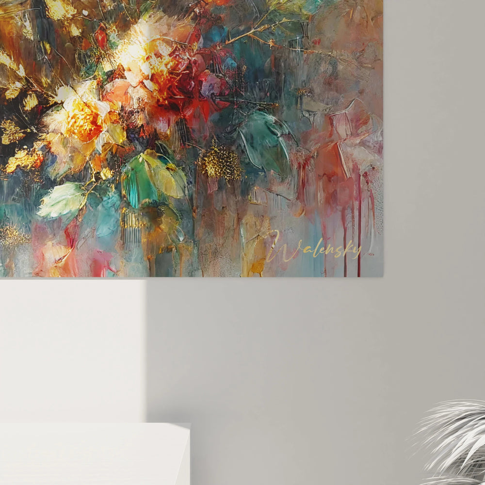 Chaque détail de ce tableau a été pensé pour évoquer la richesse et la délicatesse d’un moment suspendu. Les nuances d’or, de vert et de bleu fusionnent pour créer une ambiance chaleureuse et apaisante. Ce subtil équilibre de couleurs transforme votre pièce en un havre de paix où la nature et le raffinement se rencontrent. Le relief texturé ajoute une profondeur enveloppante, invitant votre regard à se poser délicatement sur cette scène inspirante.