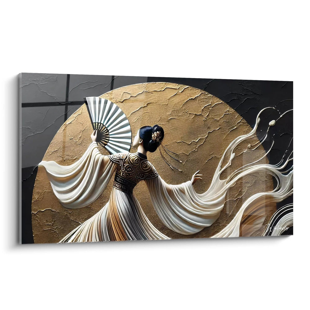 Inspirée par la danse classique et les rituels raffinés de la dynastie Tang, cette œuvre saisit la silhouette d’une danseuse figée dans un mouvement fluide, comme suspendue dans le temps. La délicatesse de ses gestes, son éventail gracieux et les manches aériennes exhalent un équilibre parfait entre force et douceur. Le cercle doré qui l’entoure irradie une harmonie spirituelle, évoquant le Yin et le Yang, symbole universel d’équilibre et de paix intérieure.