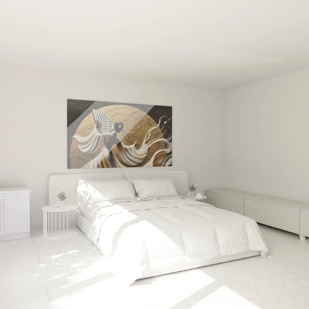 La richesse tactile du tableau se dévoile dans la texture presque palpable des robes et motifs rehaussés de relief. Le contraste puissant entre le noir profond du fond et la lumière chaude de l’or met en exergue le mouvement, créant une profondeur presque hypnotique. Les couleurs somptueuses d’or, de blanc et de noir enveloppent la scène d’une atmosphère chaleureuse et intime, parfaite pour inviter la sérénité dans votre maison.