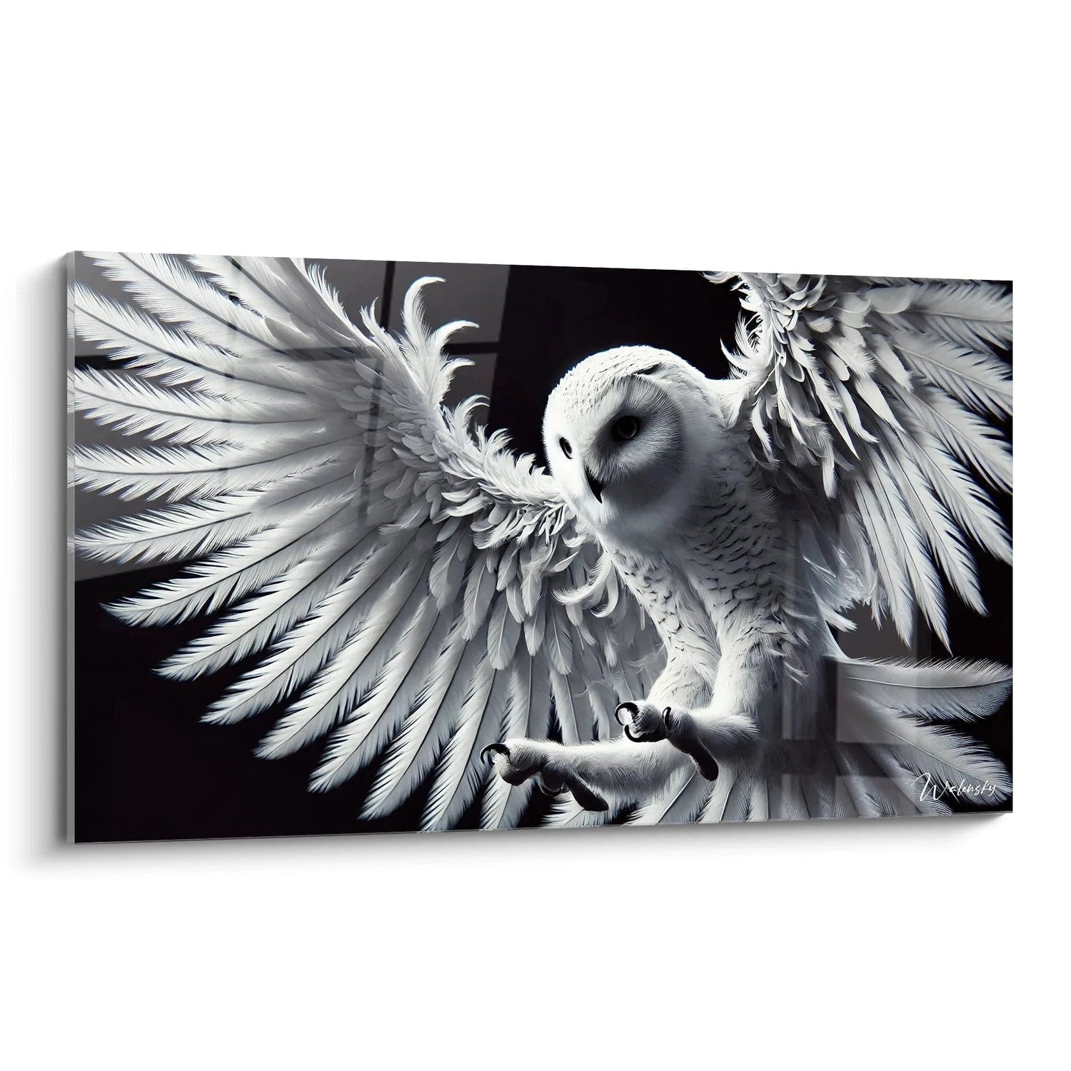 Chaque plume de la chouette est rendue avec une précision remarquable, donnant vie à son plumage soyeux et léger. La maîtrise du clair-obscur joue avec les ombres profondes et les éclats lumineux, créant un relief saisissant qui fait presque surgir l’animal de la toile. Ce contraste intense entre le blanc immaculé des ailes et le fond noir évoque l’ambiance mystérieuse et envoûtante de la nuit. Les nuances de gris apportent à l’ensemble une touche subtile, presque mystique, renforçant l’émotion véhiculée par cette œuvre.