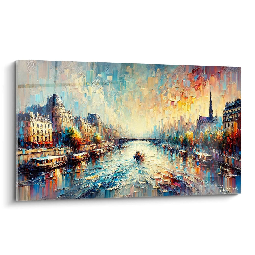 Cette œuvre incarne un instant suspendu : les reflets scintillants des façades historiques dansent sur la surface fluide du fleuve tandis que les premières lueurs du jour caressent chaque détail. Vous êtes transporté dans un tableau où l’impressionnisme se mêle à une interprétation contemporaine, créant une harmonie visuelle riche de textures et de nuances, du bleu intense de la rivière au jaune chaleureux des rayons du soleil, ponctués de touches de rouge évoquant la vie parisienne.