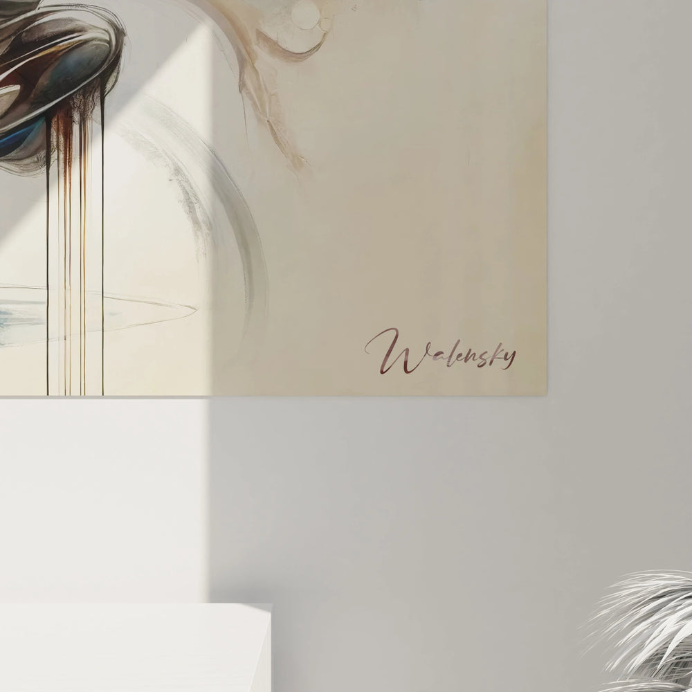Ce tableau transcende le simple décor : il incarne le chi, cette énergie vitale qui circule en nous et autour de nous. Les volutes et les formes abstraites qui l’enveloppent évoquent le souffle qui emporte tout en douceur, tout en conservant une intensité contenue. Grâce à une palette raffinée mêlant beige, bronze et bleu, chaque regard se perd dans une atmosphère à la fois apaisante et vibrante, comme une méditation en mouvement.