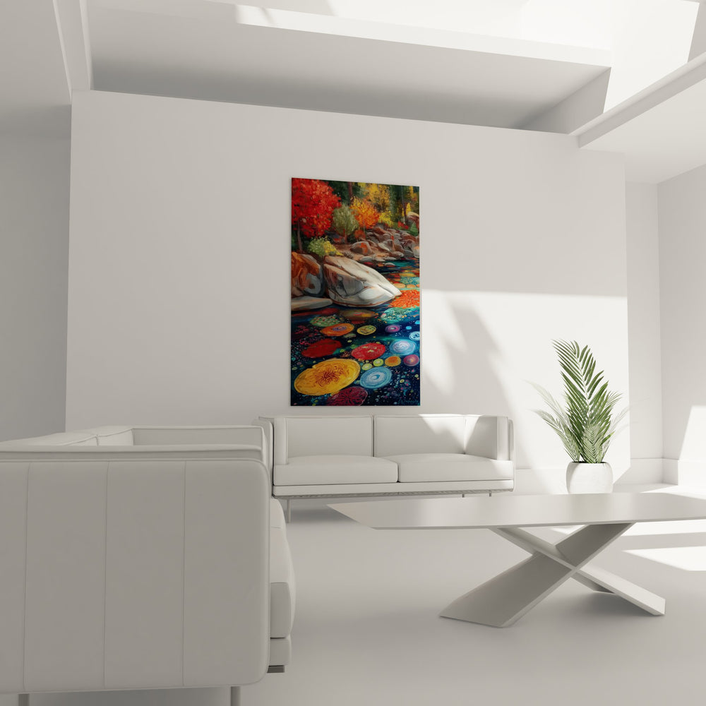 Ce tableau lac automnal présente une scène naturelle d'une beauté saisissante où les reflets colorés dans l'eau créent une symphonie visuelle exceptionnelle. L'œuvre dépeint un paysage lacustre bordé de rochers sculptés par le temps, où les couleurs d'automne se reflètent dans les eaux calmes du lac. Les arbres aux feuillages flamboyants - rouge écarlate, orange vif et jaune doré - dominent la partie supérieure de la composition, créant un contraste saisissant avec les tons plus neutres des formations rocheuses. Ce tableau mural lac capture magistralement le phénomène optique des reflets, transformant la surface de l'eau en un kaléidoscope de formes circulaires et organiques. Les peinture paysage lacustre révèle une technique picturale raffinée où chaque élément naturel trouve sa place dans une harmonie parfaite. Les rochers, peints dans des tons ocre et gris, ancrent la composition dans une réalité géologique tangible, while les reflets aquatiques ajoutent une dimension onirique et poétique. Cette œuvre d'art lac témoigne d'une observation minutieuse de la nature et d'une maîtrise technique remarquable dans le rendu des effets lumineux et des reflets automne sur lac.