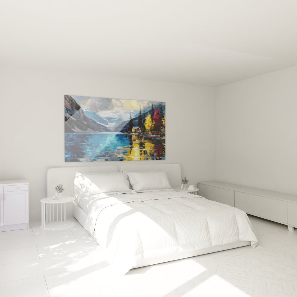 Ce tableau lac de montagne capture la beauté saisissante d'un paysage automnal où se mêlent harmonieusement les éléments naturels les plus emblématiques. Au premier plan, les eaux cristallines du lac aux reflets dorés créent un miroir parfait qui démultiplie la splendeur du paysage environnant. Cette peinture murale lac automne révèle un chalet pittoresque niché sur la rive droite, ses fenêtres illuminées évoquant la chaleur du foyer face à la grandeur sauvage de la nature. Les montagnes majestueuses s'élèvent en arrière-plan, leurs sommets partiellement enneigés contrastant avec les versants rocheux aux nuances bleutées. La végétation automnale explose en couleurs flamboyantes : les arbres se parent d'un feuillage automnal éclatant où dominent les jaunes dorés, les oranges vifs et les rouges profonds. Cette œuvre d'art lac paisible transcende la simple représentation pour offrir une véritable invitation à la contemplation. Les reflets dans l'eau créent une symétrie parfaite, doublant visuellement la richesse chromatique de cette toile paysage montagnard exceptionnelle.