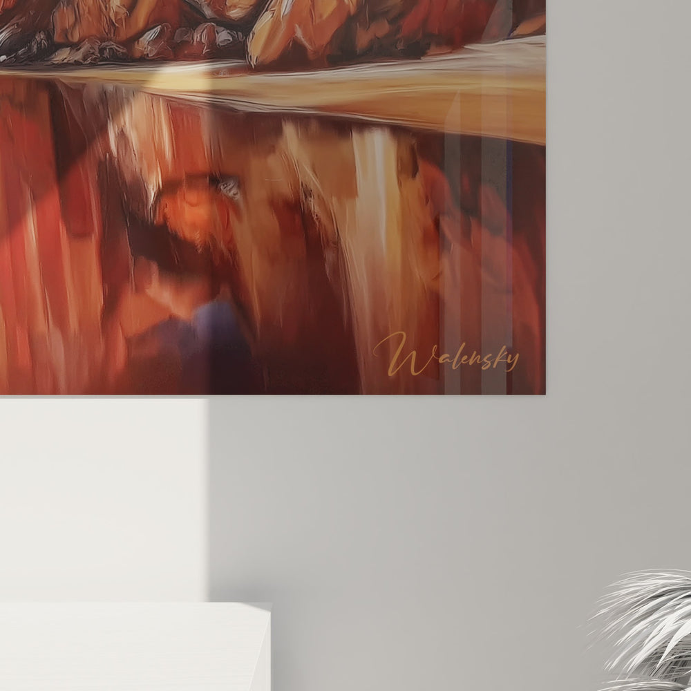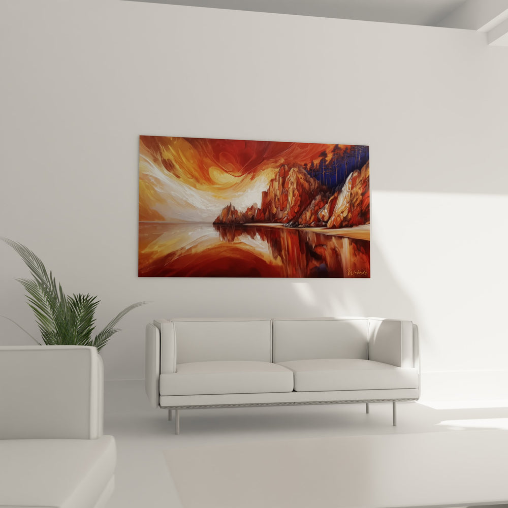 La palette chromatique de ce tableau décoratif lac puise dans les tons chauds pour créer une atmosphère apaisante et énergisante. Les rouges et oranges symbolisent la passion et la vitalité, tandis que les reflets aquatiques apportent une dimension spirituelle. Cette harmonie colorielle transforme ce tableau moderne lac en véritable source d'inspiration quotidienne, évoquant la force tranquille de la nature.