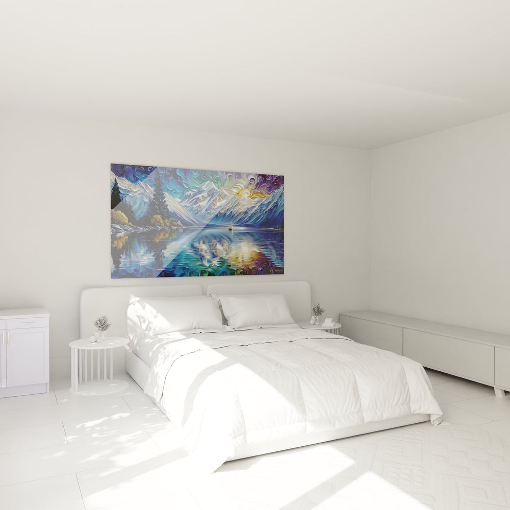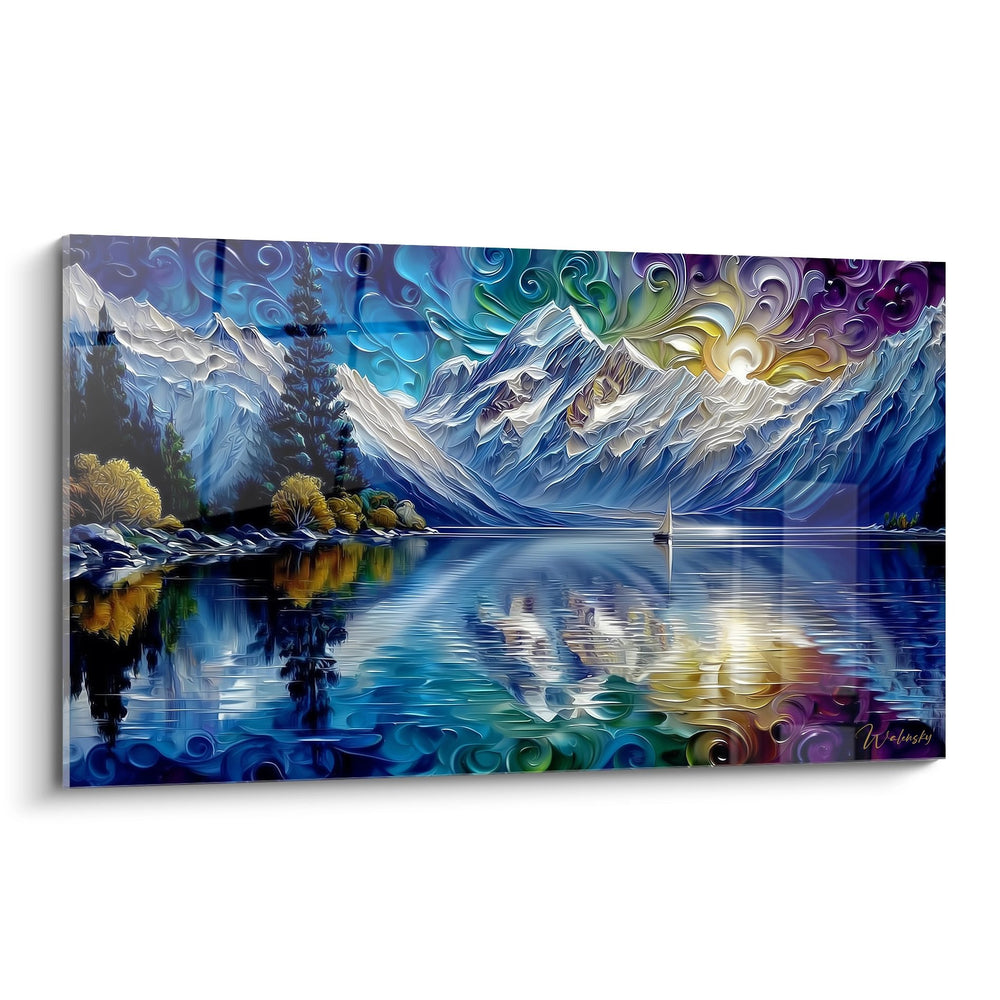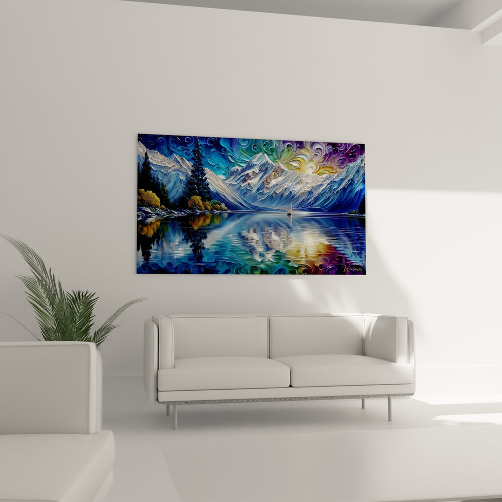 Ce tableau mural montagne présente une vision féerique d'un lac alpin niché au cœur de sommets enneigés majestueux. L'œuvre se distingue par son ciel cosmique aux tonalités extraordinaires, où des volutes colorées dansent dans un ballet céleste de bleus profonds, de violets mystérieux, de verts émeraude et de jaunes dorés. Cette peinture paysage montagnard capture parfaitement la sérénité d'un lac de haute montagne, dont la surface miroir reflète fidèlement la splendeur du panorama environnant. Les montagnes enneigées se dressent fièrement, leurs crêtes acérées se découpant contre ce firmament fantastique. Sur la rive gauche, une végétation luxuriante d'arbres aux feuillages dorés apporte une touche de chaleur automnale à cette composition. Un voilier solitaire glisse silencieusement sur les eaux calmes, ajoutant une dimension poétique à cette décoration murale montagne. Les reflets dans l'eau créent un effet de symétrie parfaite, doublant la beauté du paysage et invitant à la contemplation. Cette toile artistique alpine transforme instantanément votre intérieur en une fenêtre ouverte sur un monde onirique où réalité et imaginaire se mélangent harmonieusement.