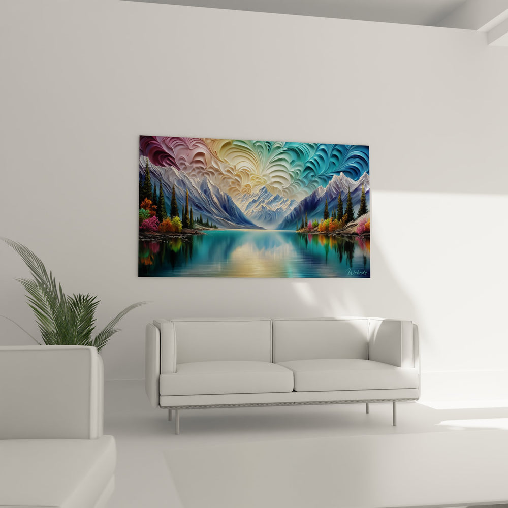 Tags : tableau lac montagne, art mural montagne, paysage montagne surréaliste, décoration montagne, vallée alpine