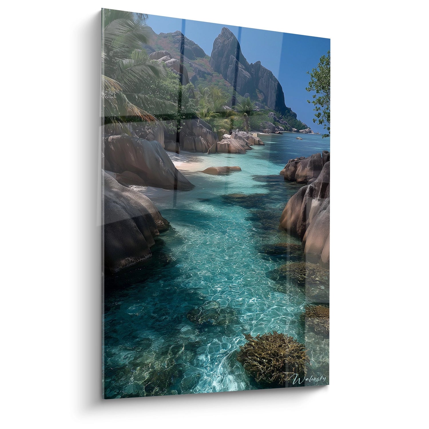 Ce magnifique tableau mural lagune tropicale capture la beauté saisissante d'une crique paradisiaque des Seychelles. L'œuvre révèle des eaux turquoise cristallines d'une transparence parfaite, permettant d'apercevoir les fonds marins et les formations coralliennes. Les rochers de granite rose caractéristiques des Seychelles encadrent cette lagune, créant un écrin naturel d'une beauté exceptionnelle. Au premier plan, l'eau peu profonde révèle ses nuances de bleu-vert, tandis que les palmiers tropicaux se penchent gracieusement vers la surface, créant des ombres dansantes. Cette décoration murale plage exotique transporte immédiatement dans un univers de détente et d'évasion. Les formations rocheuses imposantes en arrière-plan ajoutent une dimension dramatique à cette scène idyllique. Ce tableau décoratif océan Indien capture parfaitement l'essence des paysages tropicaux des Seychelles, offrant une fenêtre ouverte sur ce paradis terrestre. La composition équilibrée entre les éléments naturels crée une harmonie visuelle parfaite, idéale pour transformer n'importe quel espace en sanctuaire tropical.
