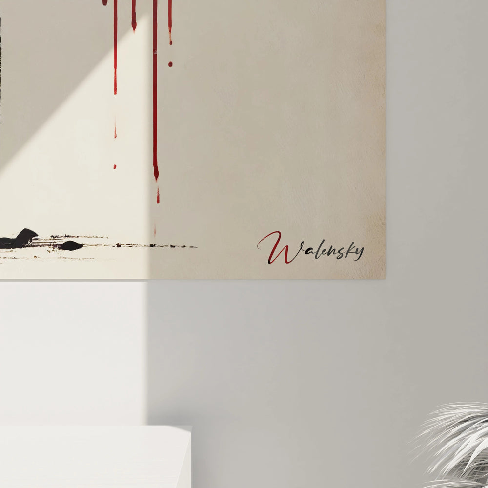 Imaginez cet instant suspendu : un samouraï agenouillé, sa lame prête, face à un soleil couchant aux nuances pourpres. Ce moment de silence avant la tempête révèle la dualité fascinante du combattant – entre la violence contenue et une paix intérieure profonde. Le tableau sublime cette tension par un contraste saisissant entre le noir profond, le beige doux du fond, et les éclats audacieux de rouge symbolisant le sang, l’énergie et la passion qui animent ce guerrier.