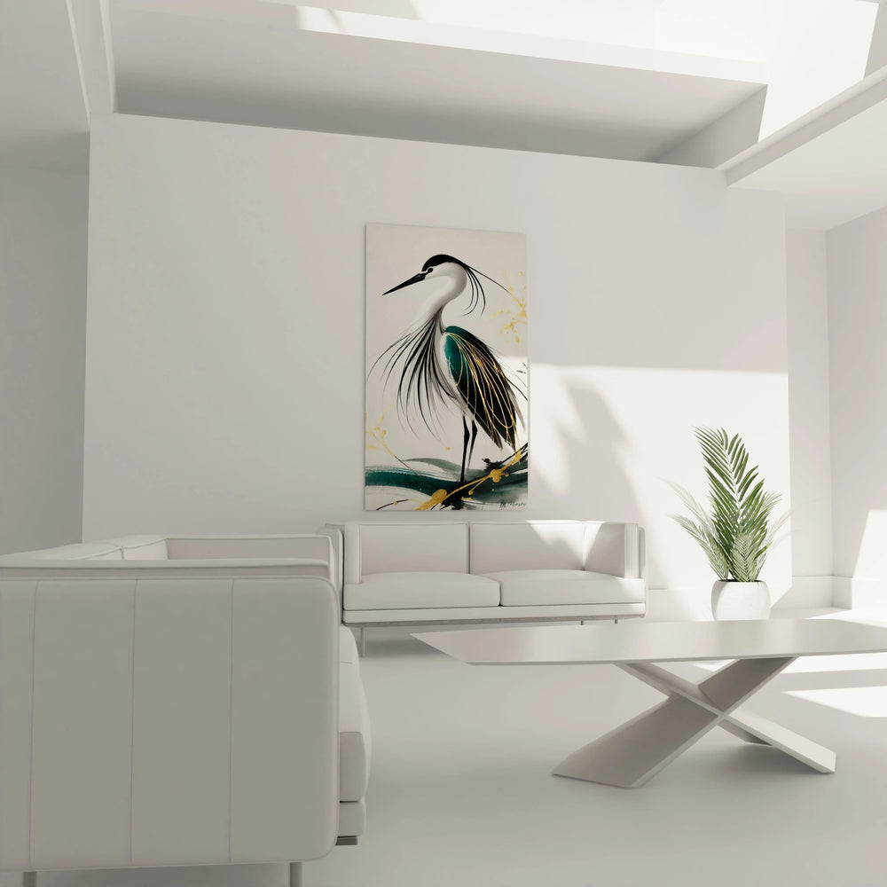 Ce tableau est né d’une inspiration profonde : saisir la légèreté d’un héron en pleine danse silencieuse au bord de l’eau. La silhouette longiligne de l’oiseau s’entrelace avec des lignes fluides et aériennes, évoquant un souffle de vent qui calme l’âme. Les touches d’or scintillent subtilement, révélant la noblesse discrète de cette scène naturelle et illuminant délicatement votre mur.