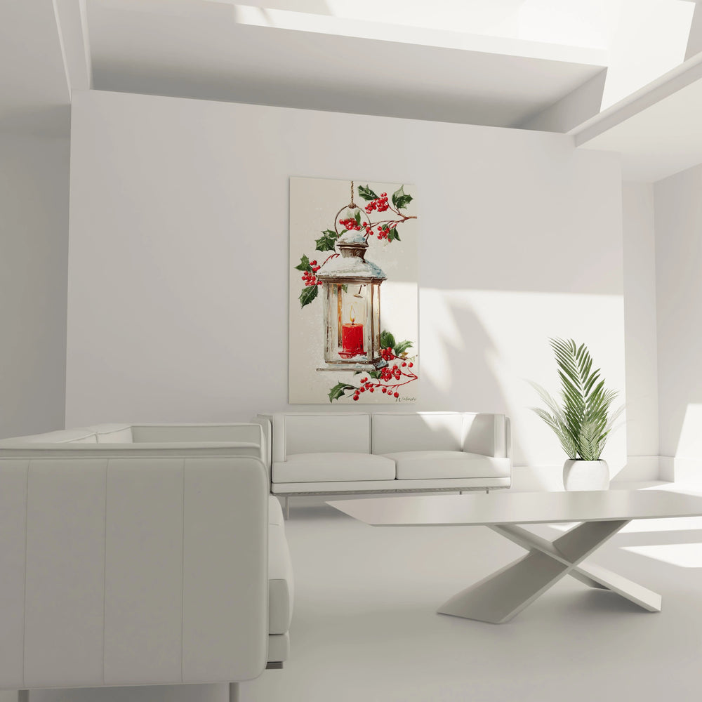 Ce tableau lanterne présente une composition saisissante où une lanterne traditionnelle en métal patiné occupe le centre de l'œuvre. La première impression révèle immédiatement l'équilibre parfait entre la chaleur d'une bougie rouge incandescente et la fraîcheur hivernale suggérée par les touches de neige délicatement posées sur la structure métallique. Le tableau lanterne de Noël se distingue par ses branches de houx aux baies écarlates qui serpentent gracieusement autour de l'objet central, créant un cadre naturel d'une beauté saisissante. L'arrière-plan beige nuancé permet à chaque détail de ressortir avec une netteté remarquable, transformant cette décoration murale lanterne en véritable point focal.