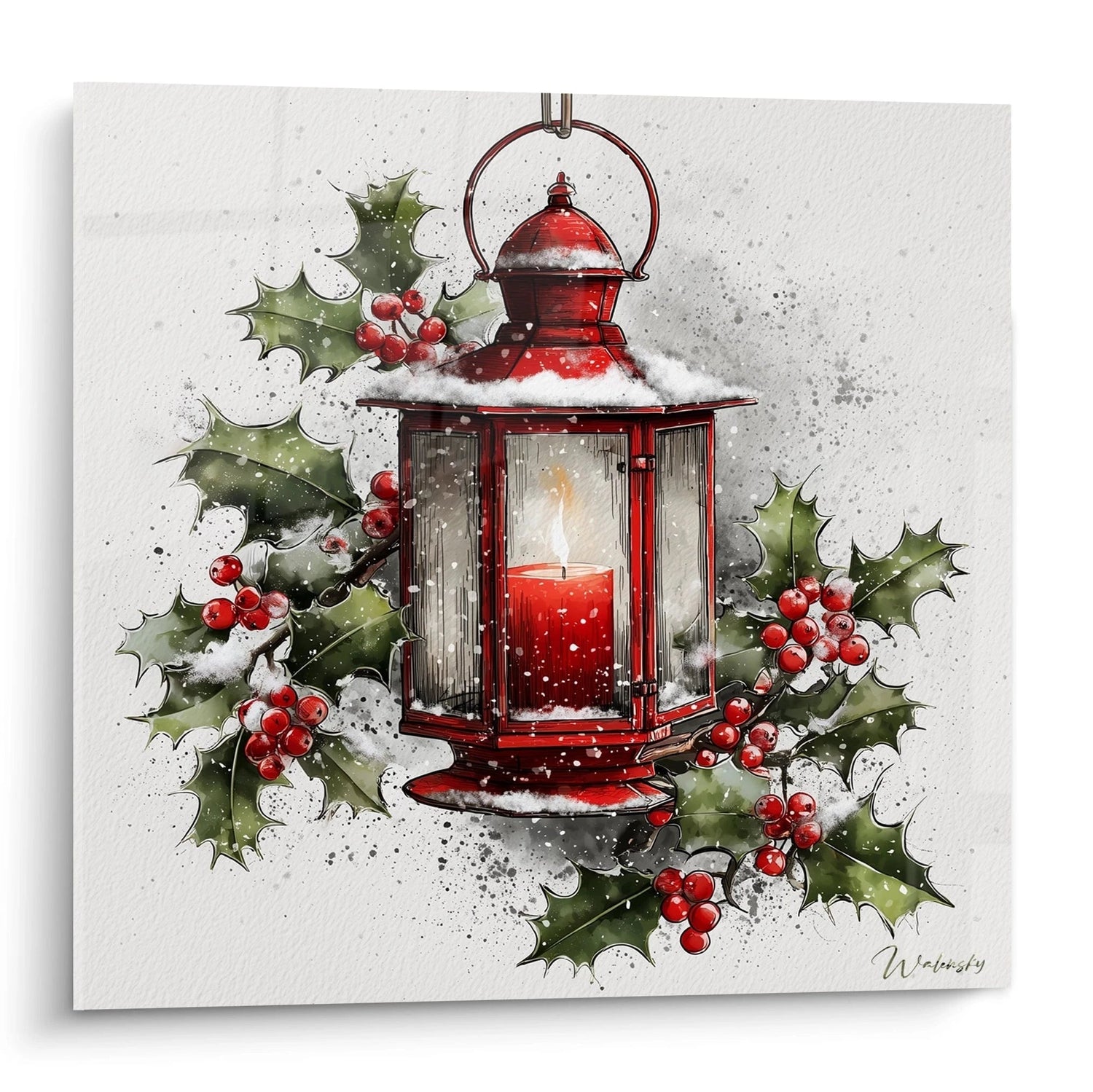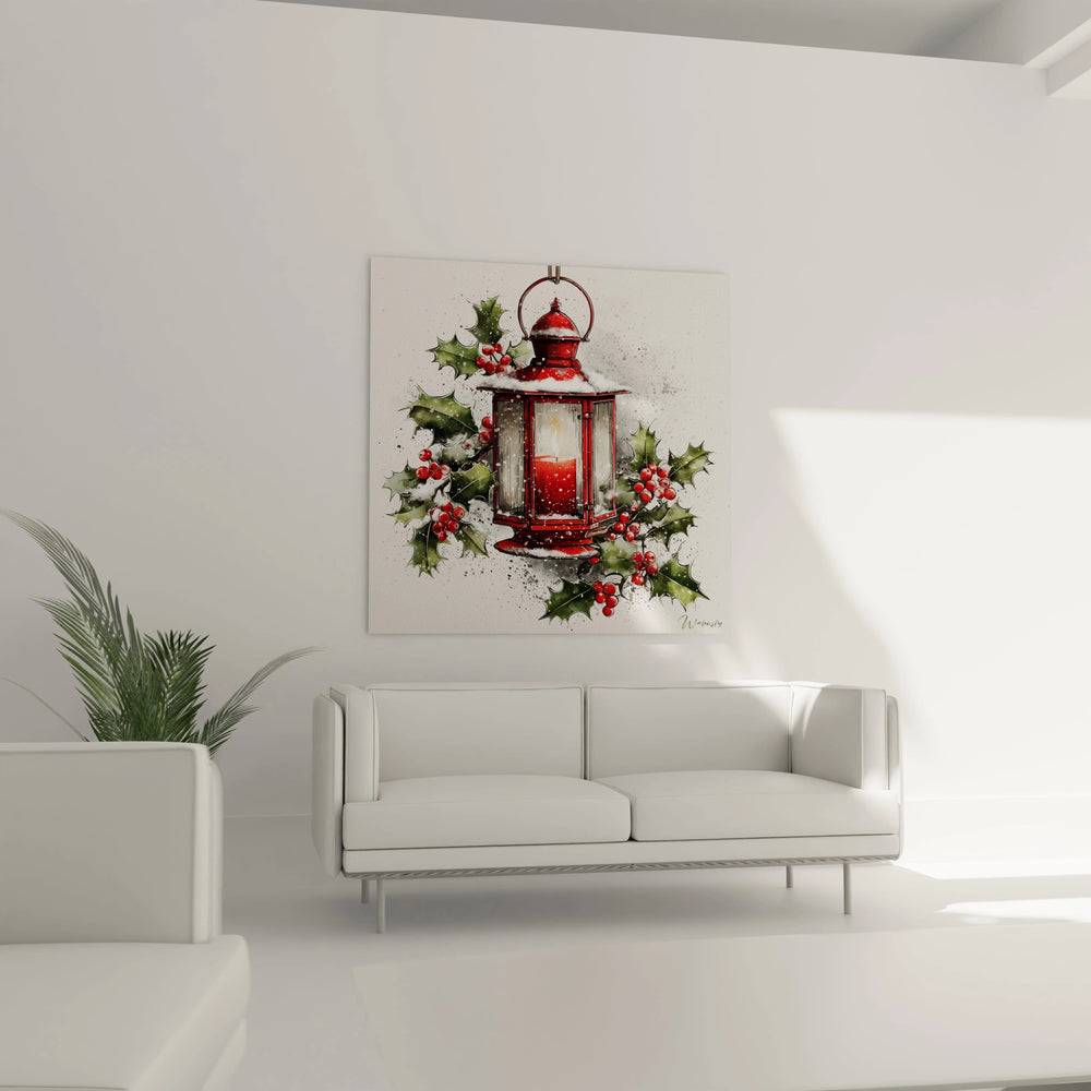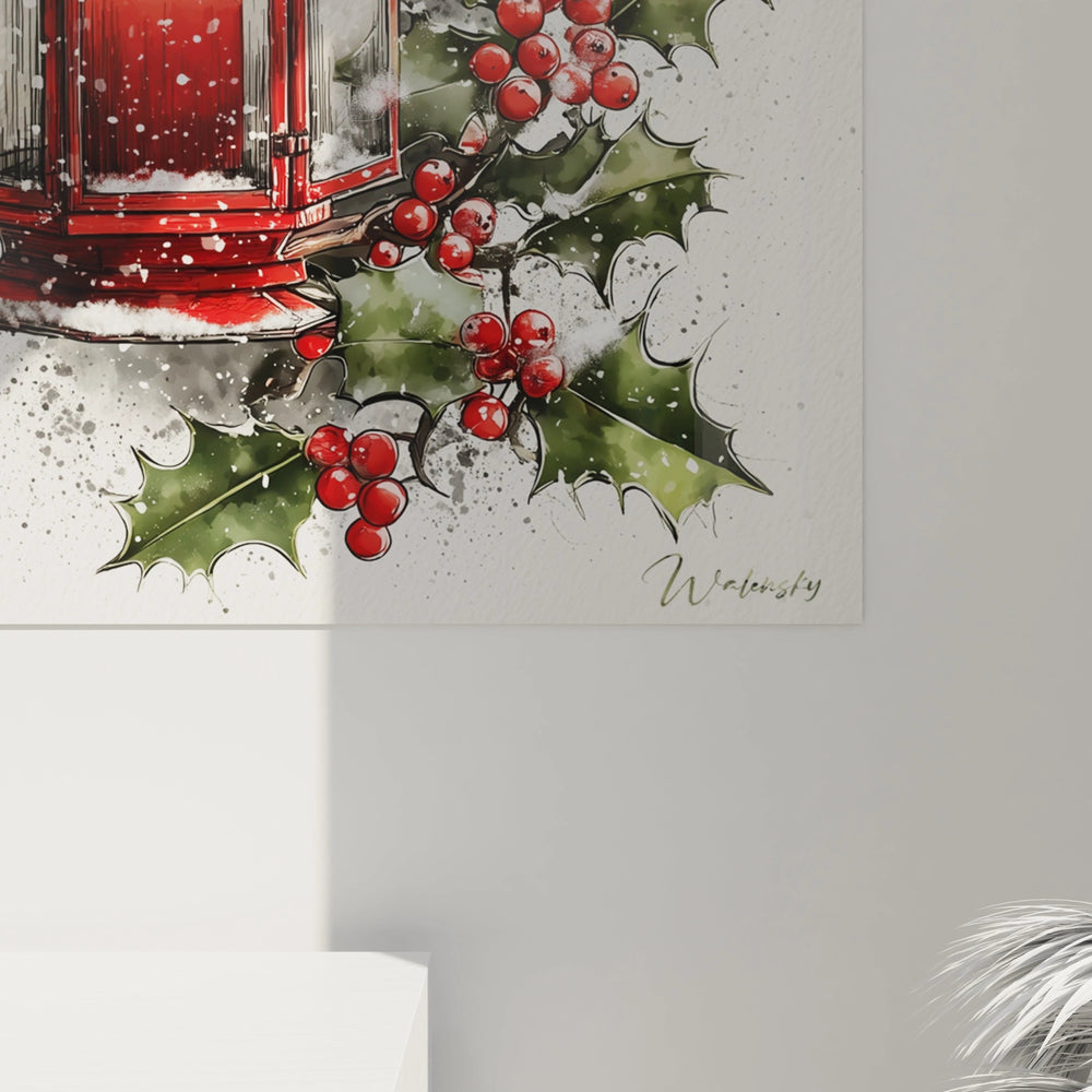 La composition de ce tableau lanterne rouge décorative suit une structure centralisée parfaitement équilibrée. La lanterne occupe le point focal central, entourée symétriquement par des branches de houx aux formes organiques qui créent un cadre naturel. L'artiste a positionné les éléments selon une perspective frontale qui permet d'apprécier pleinement les détails architecturaux de la lanterne. Les branches de houx s'étendent harmonieusement vers les angles, créant un mouvement circulaire autour du sujet principal. Cette décoration murale lanterne utilise l'espace de manière optimale, chaque zone contribuant à l'équilibre général sans jamais surcharger la composition.