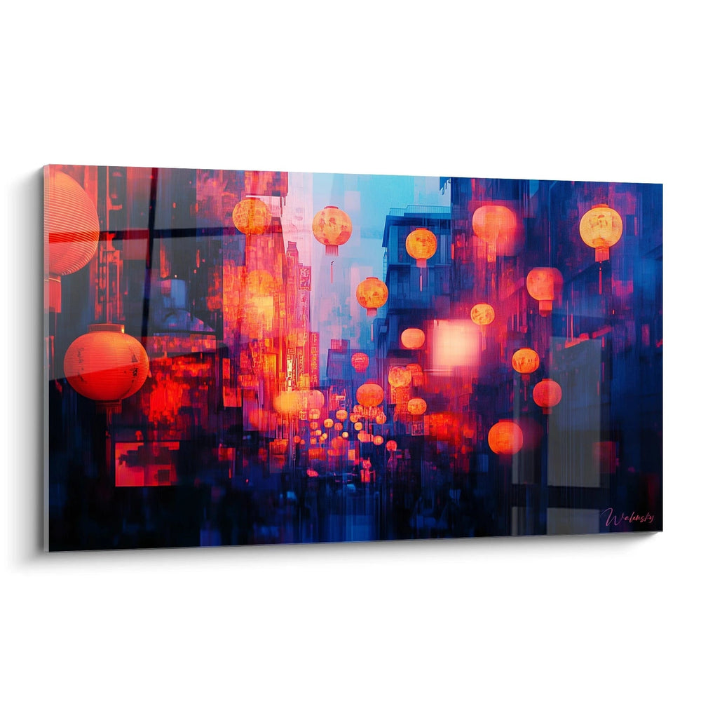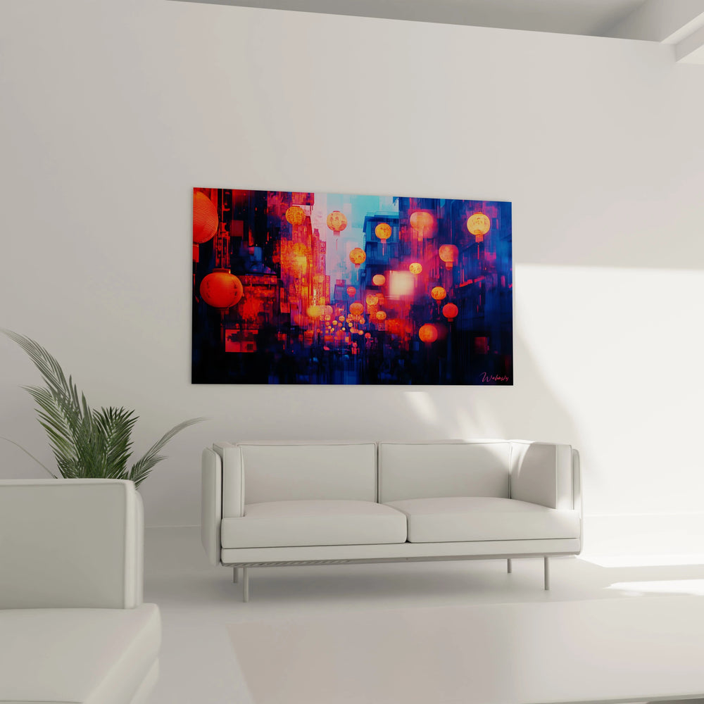 La composition de ce tableau lanternes composition équilibrée révèle une organisation savamment orchestrée où chaque élément trouve sa place dans un équilibre dynamique. Les lanternes principales occupent des positions stratégiques qui créent des points focaux multiples, permettant au regard de voyager naturellement d'un élément à l'autre. Les lignes directrices sont formées par les suspensions des lanternes et les arêtes architecturales qui structurent l'arrière-plan urbain. La perspective choisie offre une vue légèrement plongeante qui accentue la profondeur de la scène et révèle la complexité de l'environnement urbain. L'utilisation de l'espace montre une densité maîtrisée où chaque zone contribue à l'effet d'ensemble sans créer de confusion visuelle. Cette approche compositionnelle transforme l'œuvre en véritable art mural lanternes capable de structurer et dynamiser n'importe quel espace d'exposition.
