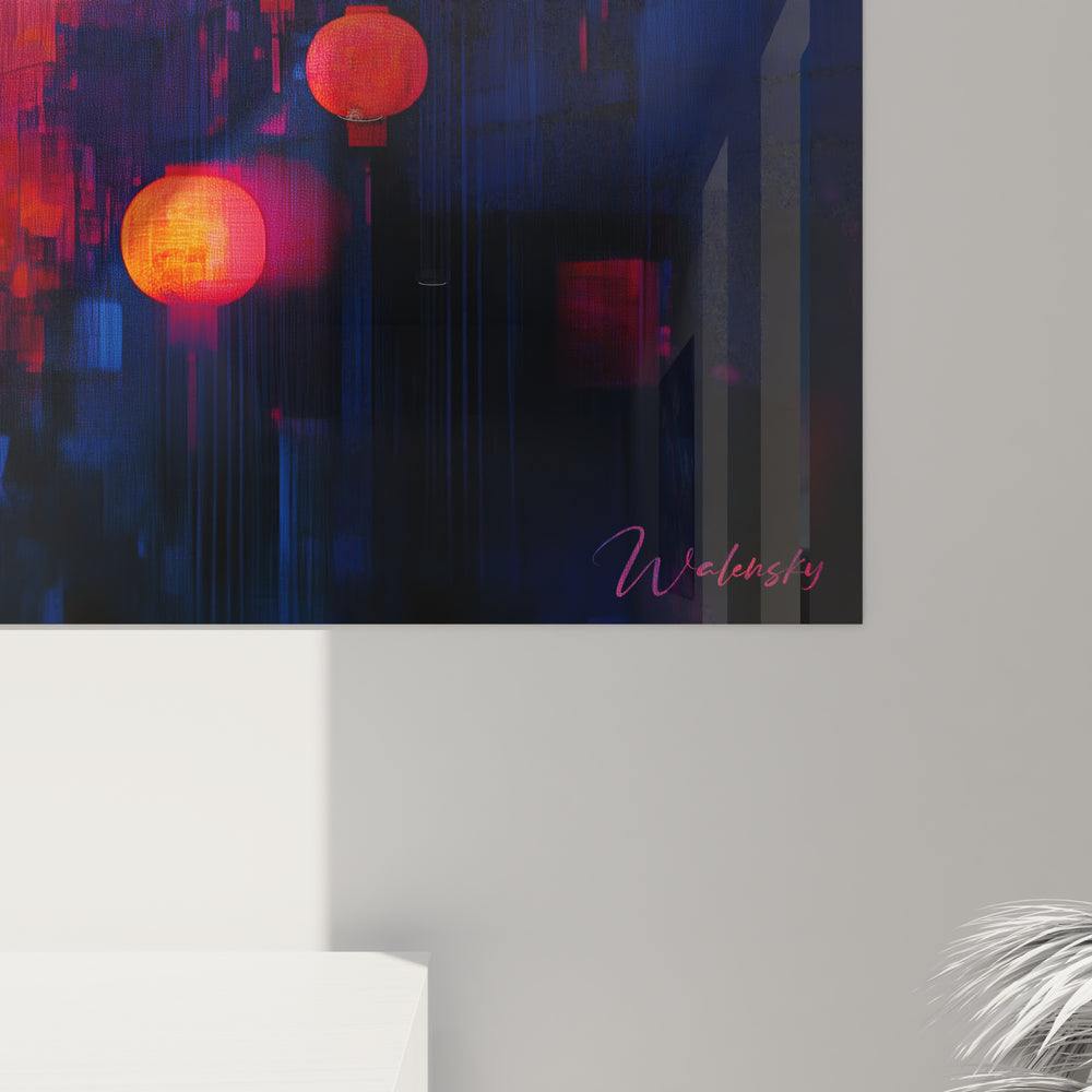 Ce tableau lanternes offre une vision saisissante d'un paysage urbain nocturne illuminé par des lanternes chinoises traditionnelles aux teintes rouge-orangé éclatantes. L'œuvre présente un tableau lanternes chinoises urbain où la tradition orientale rencontre la modernité architecturale dans une harmonie visuelle remarquable. Les lanternes rondes, suspendues à différentes hauteurs, créent un rythme visuel captivant qui guide le regard à travers la composition. La première impression révèle un contraste puissant entre les tons chauds des lanternes et les bleus profonds des structures urbaines environnantes. Cette décoration murale lanternes transforme l'espace par sa capacité à évoquer instantanément l'atmosphère mystérieuse des quartiers asiatiques nocturnes, avec ses jeux de lumière qui semblent danser entre réalité et rêve.