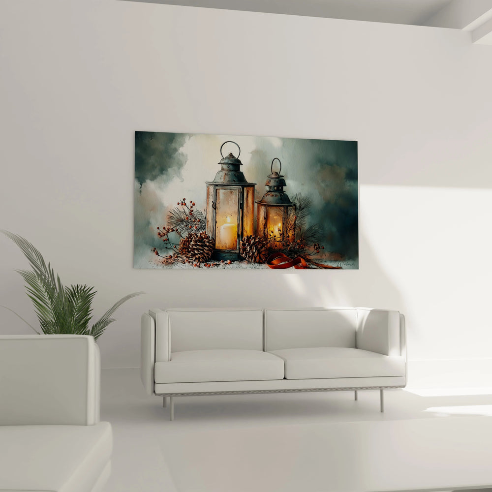 L'unicité de cette œuvre réside dans sa capacité à capturer l'âme des objets du quotidien. Chaque lanterne possède sa propre personnalité : la principale arbore une flamme stable et confiante, tandis que la seconde révèle une lumière plus timide mais tout aussi précieuse. Cette décoration murale lanternes caractère se distingue par l'authenticité de ses détails : les micro-rayures sur le métal, les variations d'épaisseur du verre, les nuances infinies de la flamme. Les éléments décoratifs naturels - pommes de pin, branchages, baies - ne sont pas de simples accessoires mais participent pleinement à la narration visuelle, créant un écosystème décoratif cohérent et touchant.
