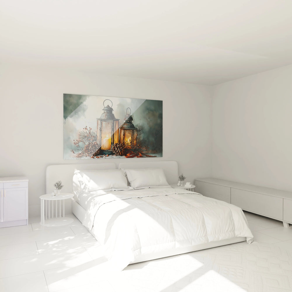 L'expérience visuelle de cette œuvre évolue selon la distance d'observation. À distance, l'ensemble forme une composition harmonieuse baignée d'une lumière dorée apaisante. En se rapprochant, mille détails se révèlent : les subtiles variations de couleur dans les flammes, les reflets complexes sur les surfaces vitrées, la texture délicate des éléments naturels. Ce tableau lanternes détails minutieux offre une lecture à plusieurs niveaux, révélant progressivement ses secrets. L'art mural lanternes atmosphère intimiste se dévoile pleinement lors de l'observation rapprochée, où chaque coup de pinceau raconte une partie de l'histoire. La profondeur de champ subtile maintient l'attention sur les éléments principaux tout en préservant la richesse de l'ensemble.
