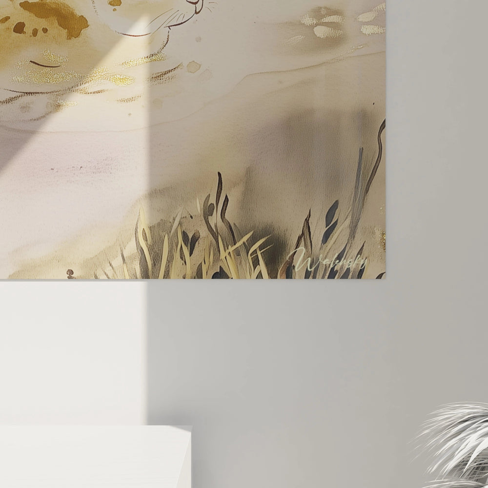 L'expérience visuelle de cette œuvre évolue considérablement selon la distance d'observation. À distance, l'harmonie générale des tons dorés et la silhouette paisible du lapin créent une impression d'ensemble apaisante. L'examen rapproché révèle la richesse des détails : les nuances subtiles du pelage tacheté, la finesse du contour des oreilles, l'expression particulière de l'œil. Ce tableau lapin détaillé offre plusieurs niveaux de lecture visuelle. Les effets de profondeur sont créés par la superposition des différents plans : les herbes au premier plan, l'animal au centre, et l'arrière-plan aux textures dorées. Cette décoration murale lapin multi-niveaux récompense l'attention du spectateur par la découverte progressive de détails cachés dans les jeux de lumière et les effets de matière.