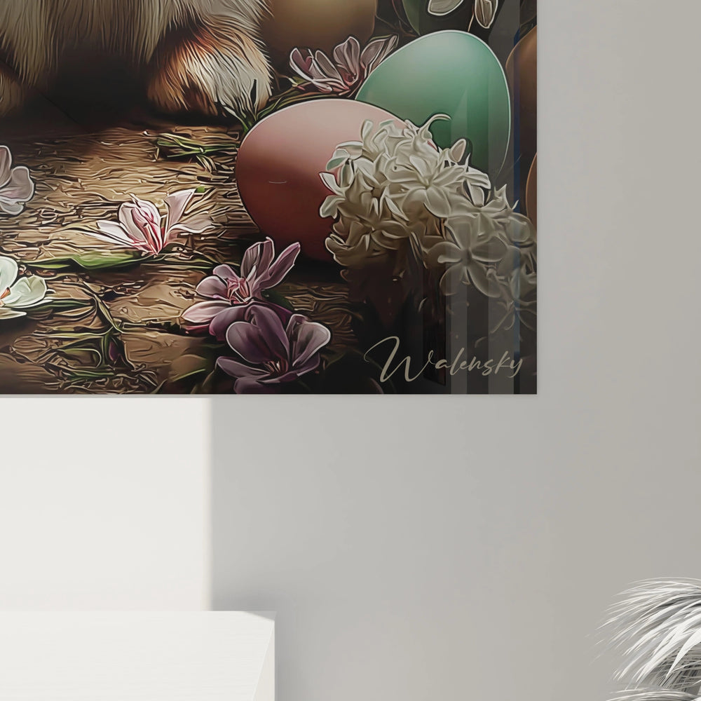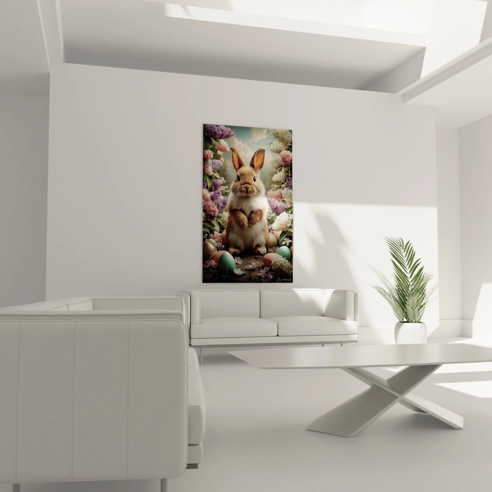Ce tableau lapin captive immédiatement par sa composition harmonieuse mettant en scène un lapin brun doré au centre d'un décor floral luxuriant. L'œuvre révèle une décoration murale lapin printemps exceptionnelle, où chaque détail contribue à créer une atmosphère de sérénité pascale. Le regard se porte naturellement sur ce personnage attendrissant, dont les oreilles dressées et les yeux expressifs témoignent d'une vivacité saisissante. Les œufs colorés disposés à la base de la composition renforcent l'identité thématique de cette œuvre lapin festif, créant un ensemble visuel cohérent et émotionnellement engageant.